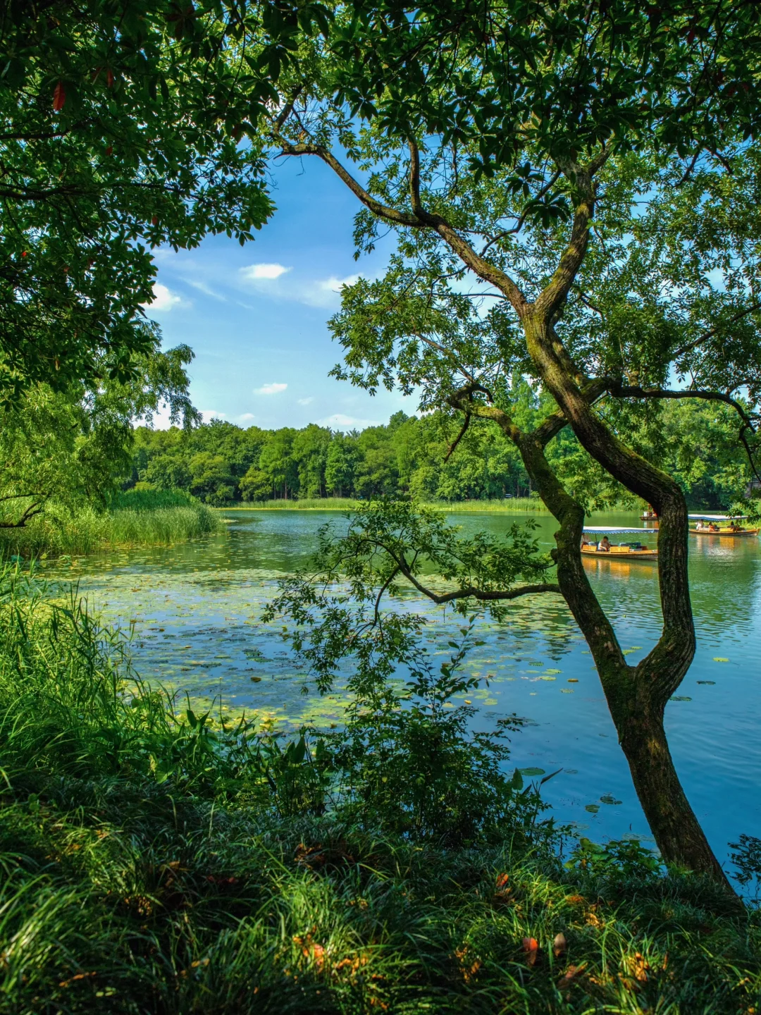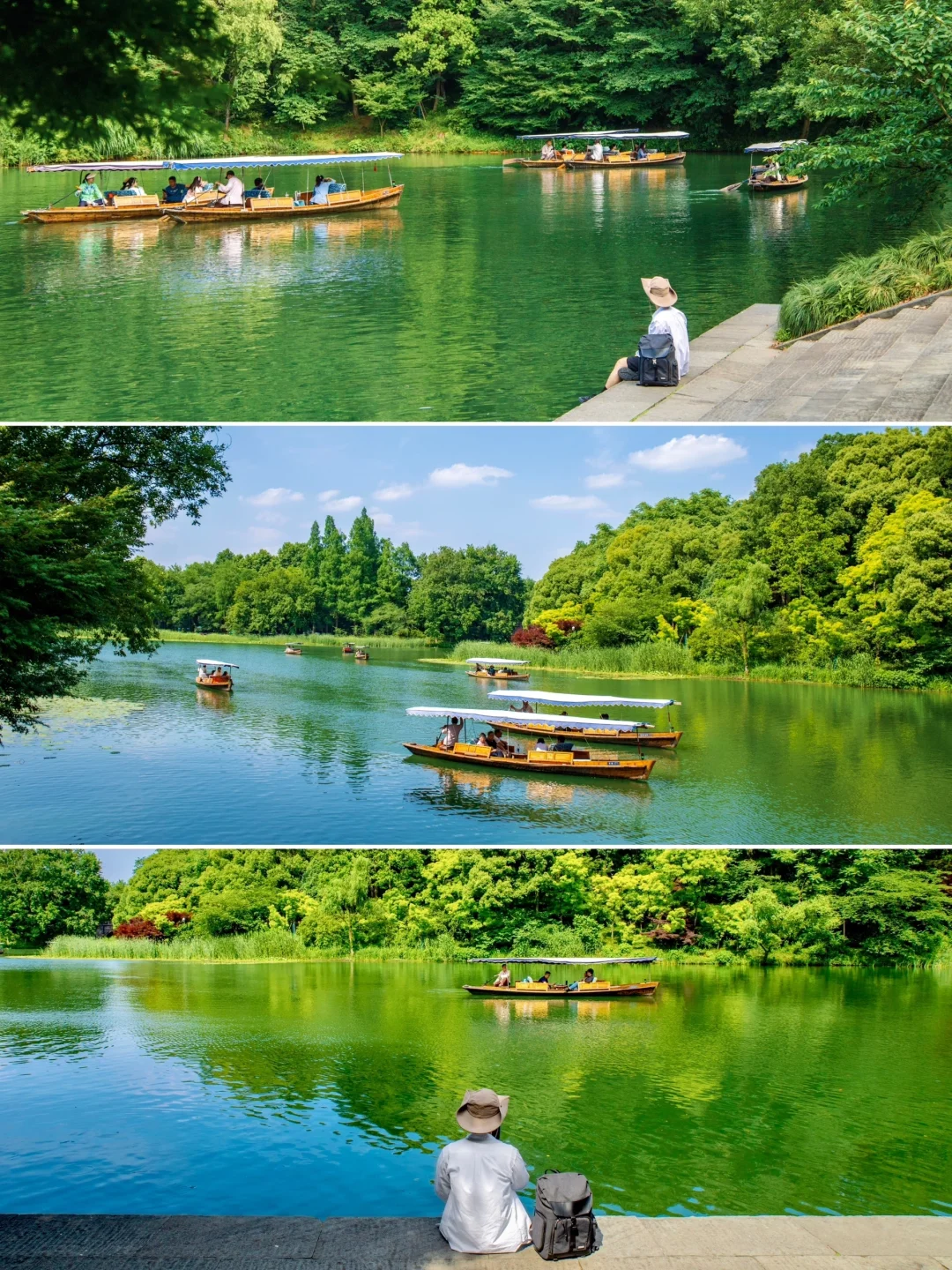 西湖游船最美航线的必经之地,适合野餐露营,坐在岸边看游船划过就像一幅油画。