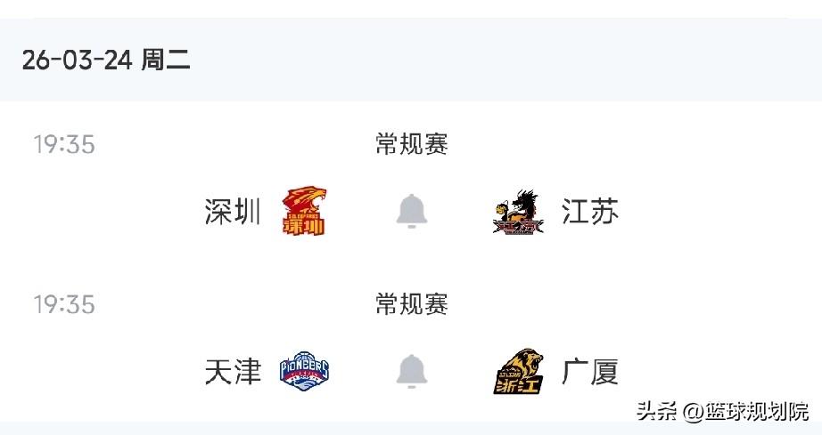 CBA今日赛程安排,仅两场比赛! 根据最新赛程安排,今日即3月24日共有两场比赛,分别为: 第一场,深圳对阵江苏 第二场,天津对阵广厦 今天这两场比赛从双方实力来看,并么有多大悬念,深圳和广厦都占有绝对优势,但是如今的CBA什么事都能发生,尤其是最近江苏队,先是赢了广东,接下来又常规时间和广厦打成平手,所以深圳队真的没有绝对把握拿下比赛!