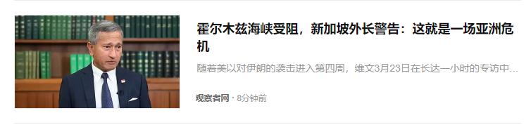 美以攻打伊朗,现在国际二道贩子也沉不住气了,就靠中介费活着的新加坡现在急了,缩水,严重缩水,都不走马六甲怎么行。 面对骤然升级的中东局势,新加坡外交部长维文发出了一个严峻的警告。“这就是一场亚洲危机。” 但其实这个“警告”,有点耸人听闻了,各国操心的是能源,据说还有粮食,可能还有别的什么,而新加坡曾经是亚洲四小龙,就靠倒买倒卖活着,一下子少了很多通行费,虽然是二级的,也受不了了,因为一级的霍尔木兹海峡被封了。 可是新加坡实在太小了,国微言轻啊,只能用这种方式,也就是似乎很专业的评价世界,企图让世界恢复战前,不然怎么办呢?但新加坡最大的特点,就是对美国是从,这个毛病不改,以后吃苦的机会多了,以后新加坡能不能象现在一样:说着大话,在大国中间装腔作势,发着横财,真的不一定了。