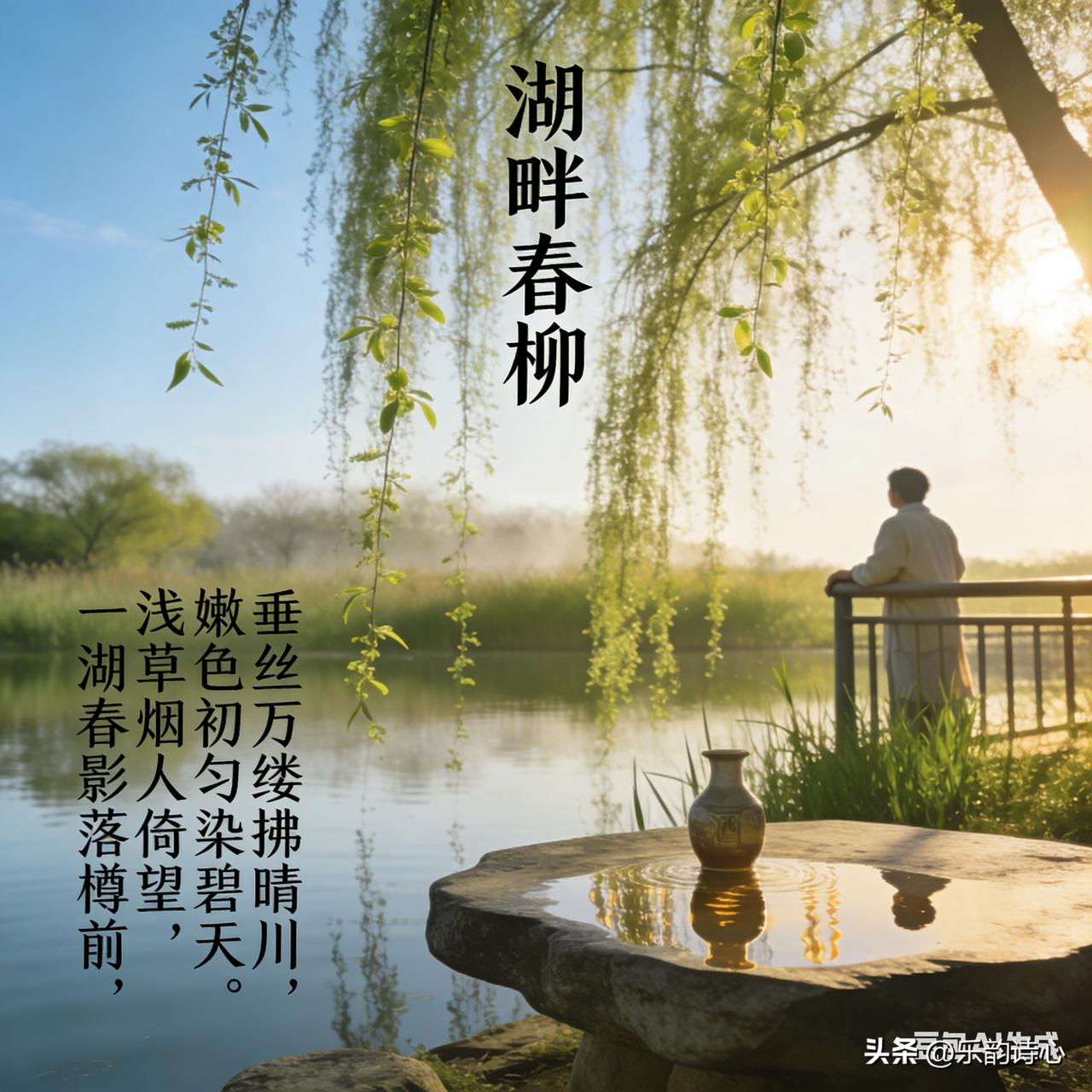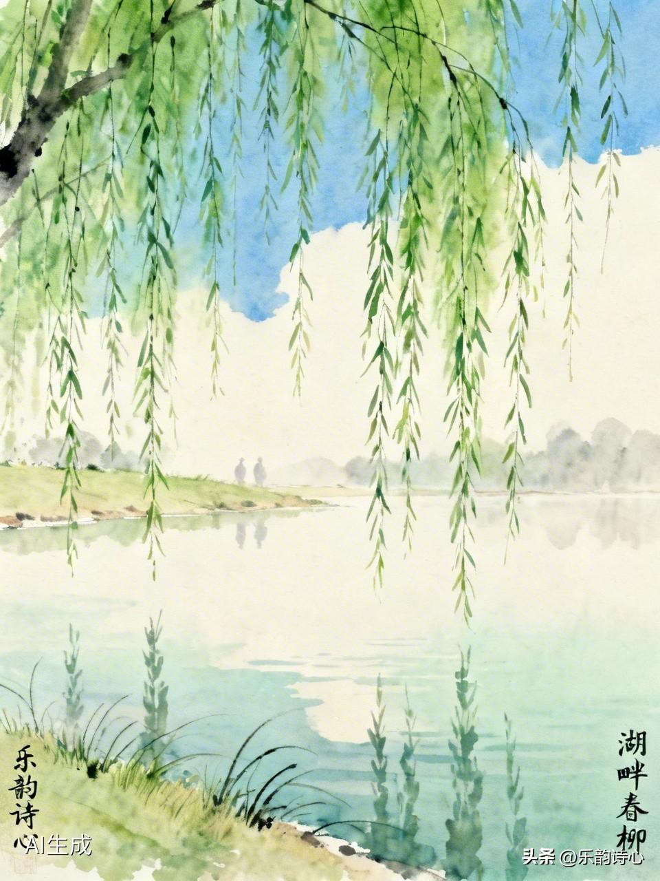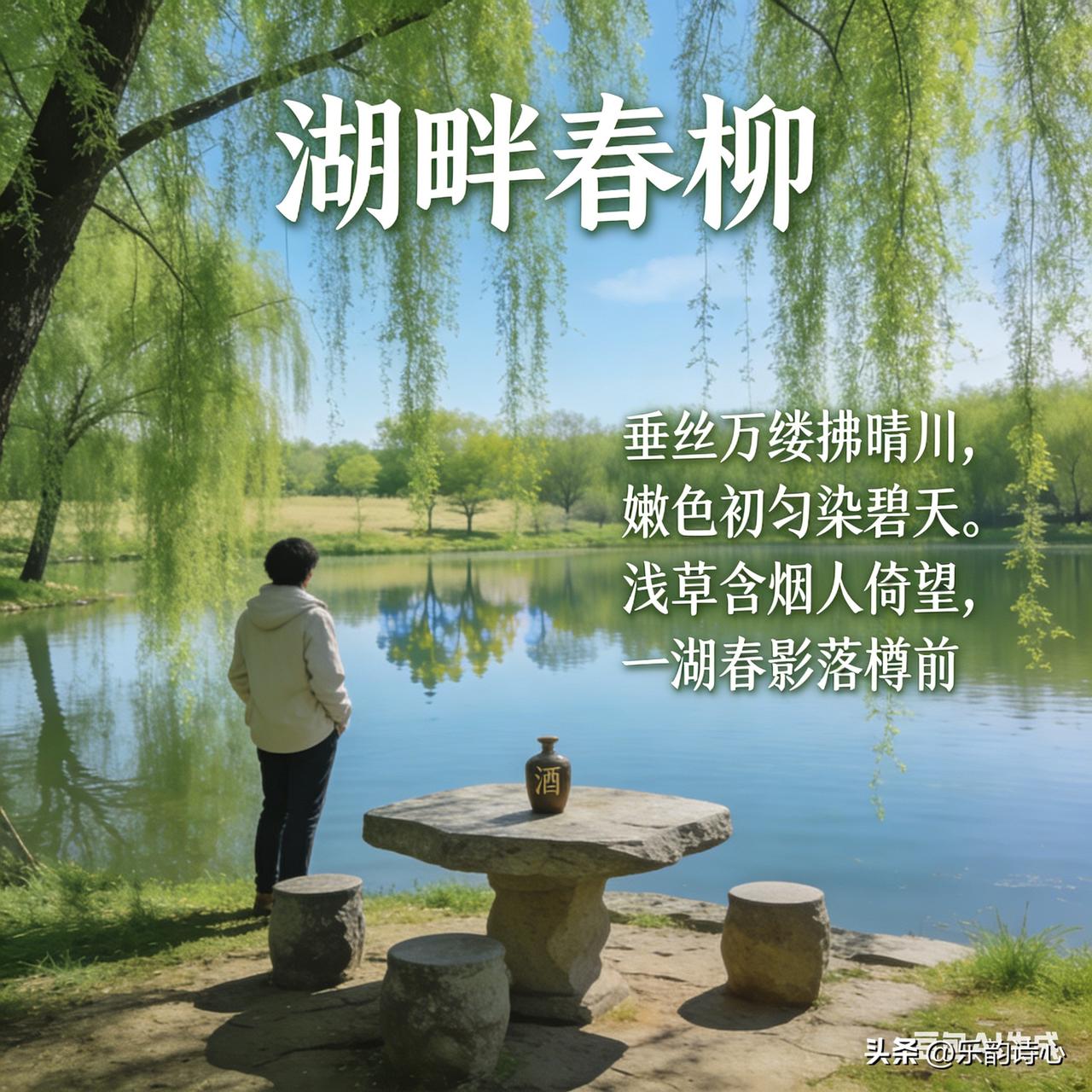 《湖畔春柳》乐韵诗心原创诗词: 垂丝万缕拂晴川, 嫩色初句染碧天。 浅草含烟人倚望, 一湖春影落樽前。 此诗描绘湖畔春日柳景。首句写千万柳丝轻拂湖面,尽显柔美;次句言柳之嫩色如笔初染,似与碧天相融;第三句刻画浅草似烟,有人倚立眺望;尾句点明一湖春色倒映杯中,将眼前美景与饮酒之趣结合,尽显悠然惬意与对春光的沉醉。