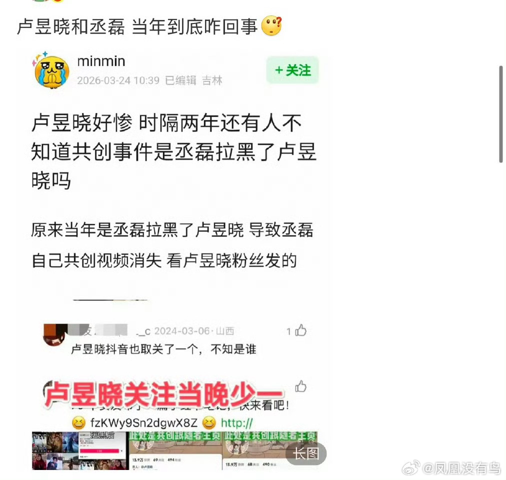 卢昱晓粉丝和丞磊粉丝交流起来了我翻了一下,还是因为云之羽时期两个人有一个共创后面这个共创被隐藏了,然后最新卢昱晓粉丝说法是卢昱晓当时被拉黑了