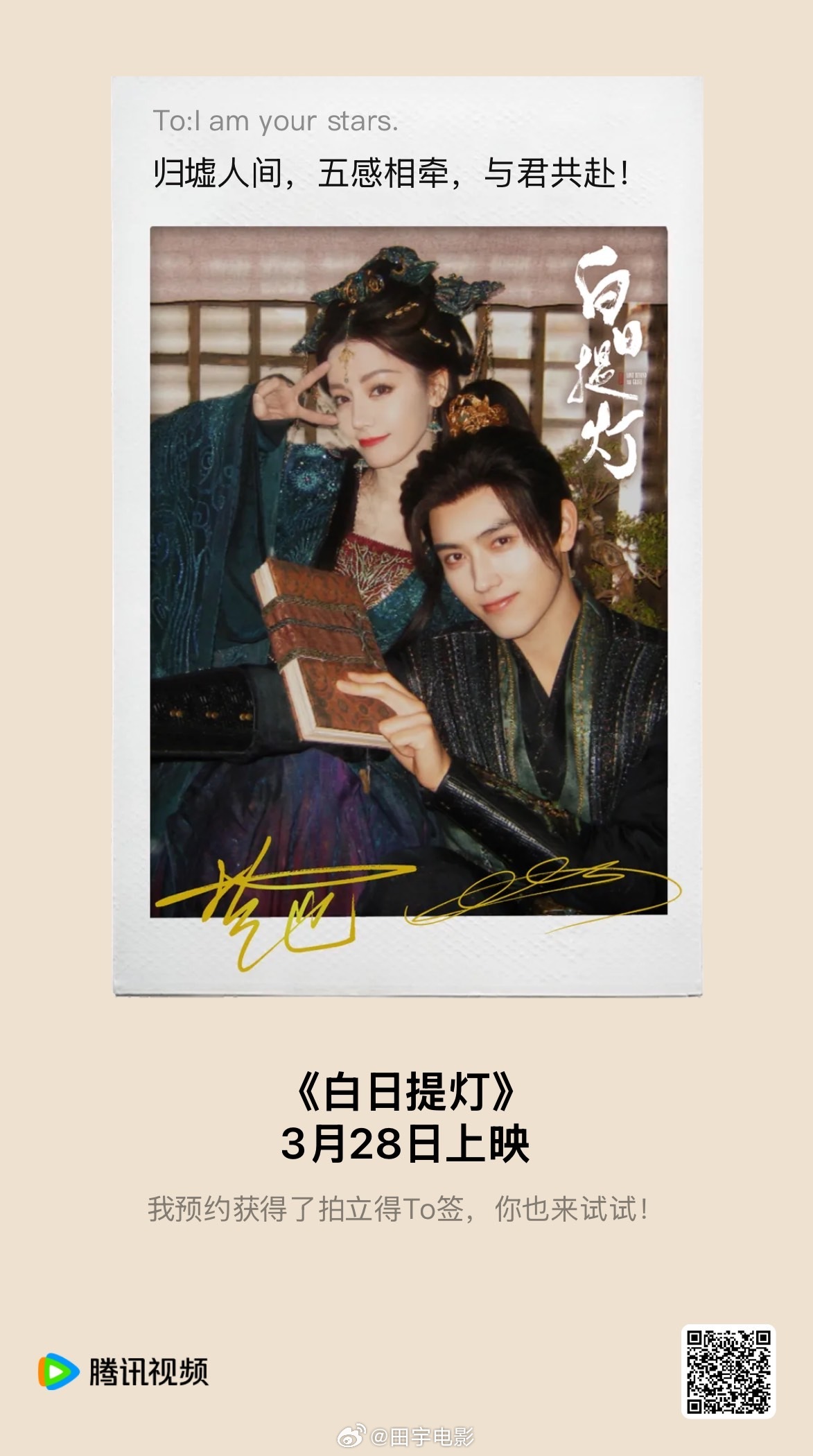 白日提灯《白日提灯》的预约量超540万了,典型的未播先爆。剧方对剧迷太友好了,预约会自动生成一张电子版的拍立得签名海报。热巴又美出了新高度,哪个角度瞅着都很漂亮。剧开播进入倒计时4,3月28号中午12点开播,迪丽热巴等我们看你呦,期待的心情胜似千言万语。mark一下,蹲播出咯。迪丽热巴贺思慕