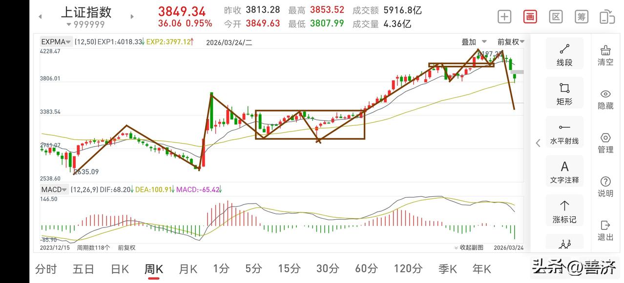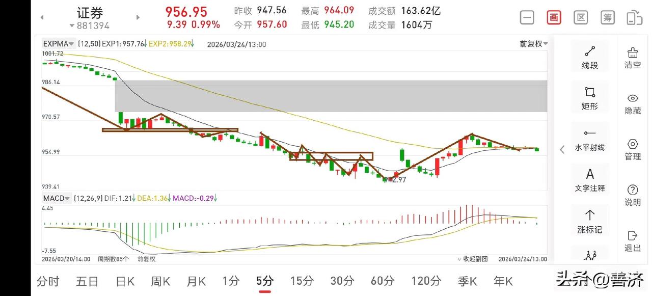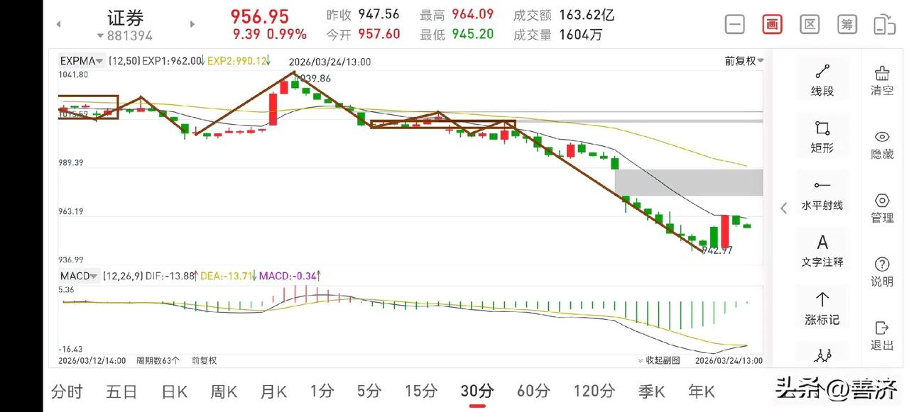 聊聊证券板块(2026.3.24) 今天证券板块有所反弹,属于超跌反弹性质,但它无法改变它的下跌趋势,所以这段下跌还没有完全结束,大机会还没有到来,但短线迎来了做多机会,如果你是按5分钟级别操作的,此处是可以考虑的。 1.从30分钟图一上看,目前正在构建30分钟中枢,并有望扩张成一个日线下跌中枢,也就是说,这里构建的30分钟中枢可能没有向下离开段,而是直接会升级成一个日线中枢,待构建完成后,还是有下探空间的,最终下探位置大概会击破周年线,然后才会止跌企稳,向上反转。 2.从5分钟图二上看,上午基本完成了30分钟一笔的反弹,下午看回调不破新低,所以想做短线的朋友,下午回调不破新低的时候可考虑回补三成仓位,然后耐心等待向上反弹,并有望在明后天回补上方缺口,缺口回补后可考虑把三成仓位再退出来。 3.再看一下大盘周线指数图三,目前正在回踩周线一笔,而它的下方是有缺口的,这个缺口大概率会回补,从而形成二个同向周线中枢有重叠构建的月线中枢结构,所以从方面看,还是有下跌空间的,在大盘有下跌空间的情况下,指望证券板块能走好是不现实的,但证券板块也会有这么大的下跌空间吗?显然不会,因为它之前就没涨过,不可能再出现大幅下挫,只是大盘在下挫的同时,它在底部做一个小幅震荡下行而已,但也不存在它会直接反转的情况。 总之,大的机会还没来临,还需要耐心等待一段时间。我要上精选-全民写作大赛 证券板块解析