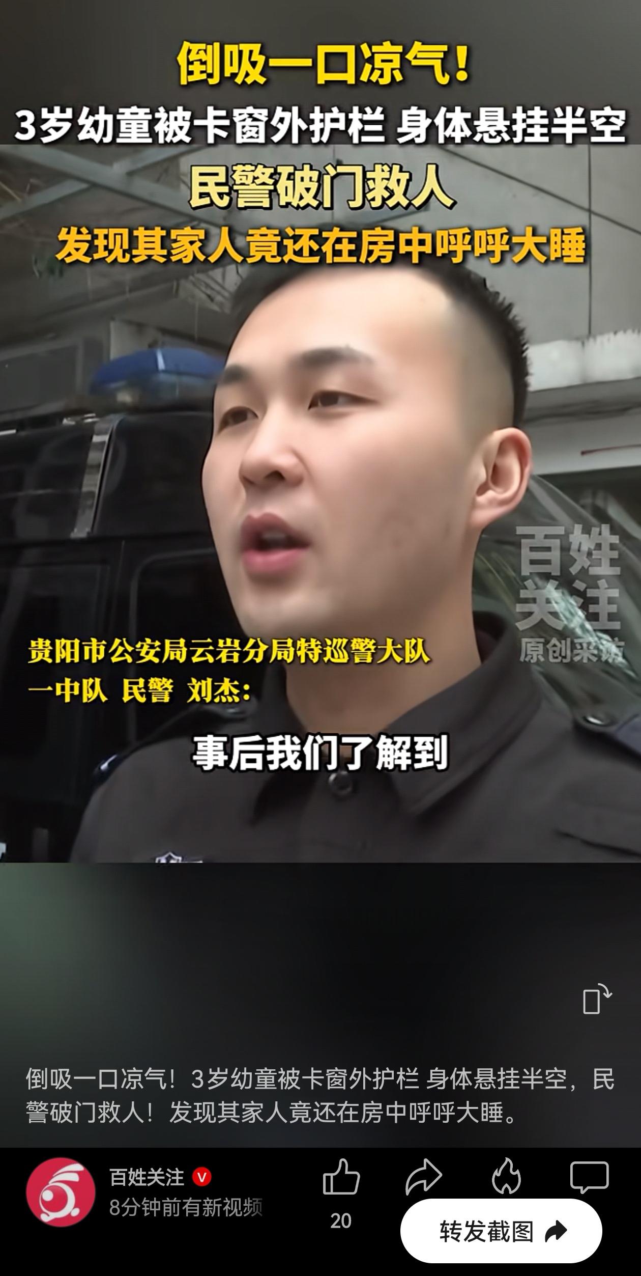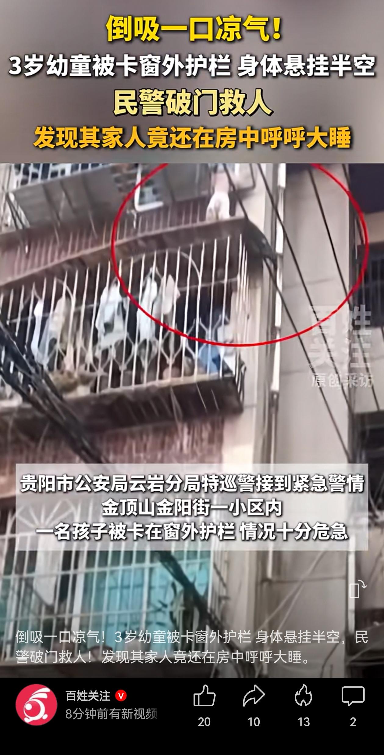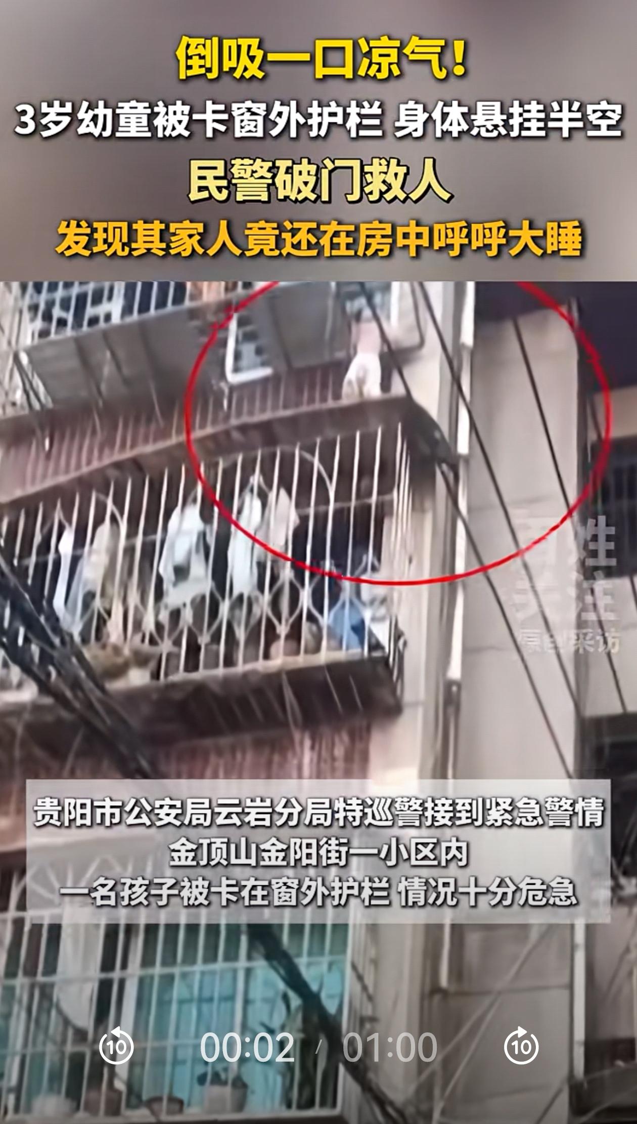 心太大了吧!贵州贵阳一个小区,一个幼童整个身体挂在7楼窗外,就靠两只小手撑着,命悬一线。 幸亏被邻居发现,马上报警。警察来到很快,和邻居一起敲门,都以为家中无人。 民警破门,终于把孩子安全救下!闹出这么大动静,孩子被救出后,才知道孩子舅舅就在屋里呼呼大睡,完全不知道自家侄女差点就没了。 这已经不是“心大”能形容的了。说真的,这事能平安收场,纯属运气。 心大的父母,遇到心更大的舅舅!一个敢交,一个敢接!心大的父母把3岁的娃交给一个刚下夜班的人?舅舅心更大,答应了照看孩子,结果倒头就睡,睡得比谁都沉! 想想都后怕啊! 带娃这事,真不能靠“想当然”。不能觉得“家里有人就行”,得看这个人有没有能力看,这不是信不信任的问题,是生理上扛得住扛不住的问题! 是啊,真是万幸! 这事能化险为夷,全靠“外人”,比家里人还上心。可孩子的安全,不能每次都指望邻居眼尖、警察跑得快啊。 这次是命大,但命不能总靠“大”。该装的防护栏装好,该负的责任负起来,别等到出了事再后悔。 孩子的命只有一条,哪能次次容得下两个心大的人凑一块儿去赌哦? 信息来源:百姓关注