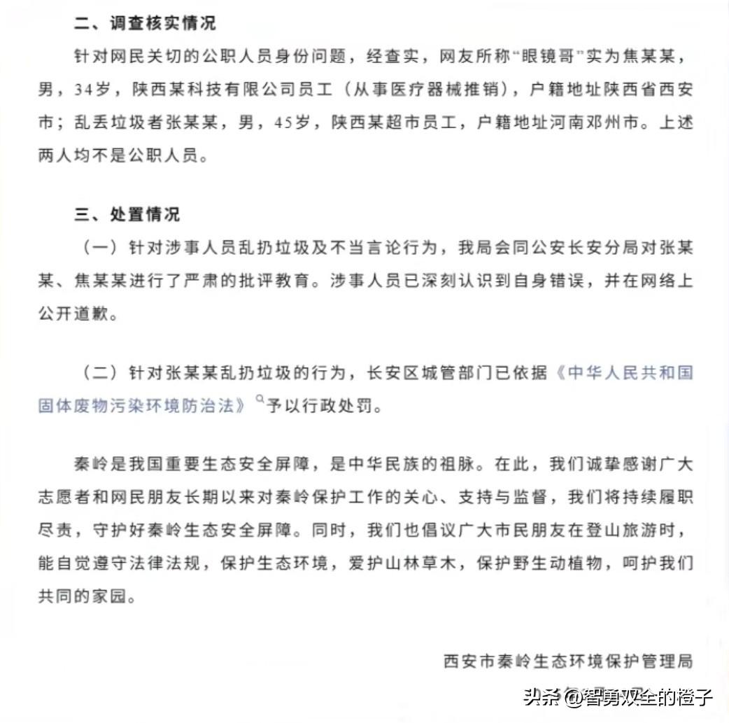 这回硬气不起来了!秦岭乱丢垃圾的两人道歉了,眼镜男34岁,陕西西安人,是某公司的销售,另一人45岁,河南邓州人,某超市的员工,看两人还一脸的不愿意,本来就是小事,说了捡起来就没事儿了,非得杠! 志愿者在前面捡垃圾,这两人就在后面乱扔,稍微有点素质,被人指出来就应该立即捡起来,这两人倒好,还是动手打人,就应该罚他们去景区做公益,批评教育还是太轻了!