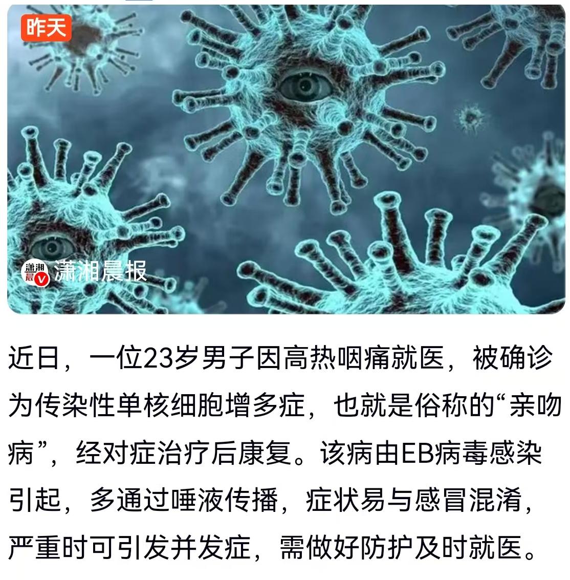 提到“亲吻”,大多数人脑海里浮现的都是温馨、浪漫的画面。但谁能想到,这表达爱意的动作,竟然能让人住进医院。近日,就有一位23岁的年轻小伙,因为高热不退、喉咙痛得像吞了刀片一样去就医,结果被医生确诊为“传染性单核细胞增多症”。这名字听着学术,它还有一个让人脸红心跳的俗称——“亲吻病”。 这事儿可不是开玩笑的。这位23岁的患者最初以为自己只是普通的重感冒,毕竟发烧、咽痛这些症状,和感冒太像了。但检查结果却指向了背后的真凶:EB病毒。这是一种非常狡猾的病毒,主要通过唾液传播。也就是说,一次深情的接吻,或者家长嚼碎了食物喂孩子,都可能成为病毒的“顺风车”。 很多人对“亲吻病”感到陌生,其实它离我们并不遥远。根据权威医学资料,传染性单核细胞增多症的典型症状就是发热、咽炎、淋巴结肿大,甚至肝脾也会跟着“遭殃”肿大。如果不做血常规检查,外周血淋巴细胞比例升高、异型淋巴细胞增多这些关键指标根本发现不了。这就是为什么很多人把它当成感冒治,结果药吃了一堆却不见好。虽然这个病的病死率极低,大约在0.1%-0.2%之间,听起来似乎没那么可怕,但它的并发症却不容小觑。急性溶血性贫血、脾破裂、神经系统并发症,哪一个拿出来都能让人脱层皮。尤其是脾破裂,这在剧烈运动或者外力撞击下,简直是隐形的“定时炸弹”。 好在这位23岁的小伙子就医及时,经过对症治疗后已经康复出院。但这起病例给我们所有人,特别是年轻情侣和有娃家庭提了个醒。爱意表达没问题,但得讲究“边界感”。EB病毒潜伏在很多人体内,携带者可能自己都不知道。你一口我一口的亲密喂食,或者是热烈的深吻,在免疫力低下的时候,就容易让病毒趁虚而入。 千万别觉得“亲吻病”离我们很远,也不要觉得它是小孩子的“专属”。成年人一旦感染,症状往往比孩子更猛烈。如果出现长期的发热、咽痛,而且脖子上的淋巴结莫名肿大,千万别硬扛着当感冒治,赶紧去医院查个血常规。对于这种病毒,目前并没有特效的疫苗,最好的“解药”就是预防。分餐制、使用公筷、避免随意亲吻婴幼儿,这些看似“生分”的举动,其实才是对家人健康最大的负责。 浪漫虽好,也得拿捏分寸。毕竟,健康的身体,才是享受生活的前提。别让原本甜蜜的“吻”,变成了伤害身体的“刃”。