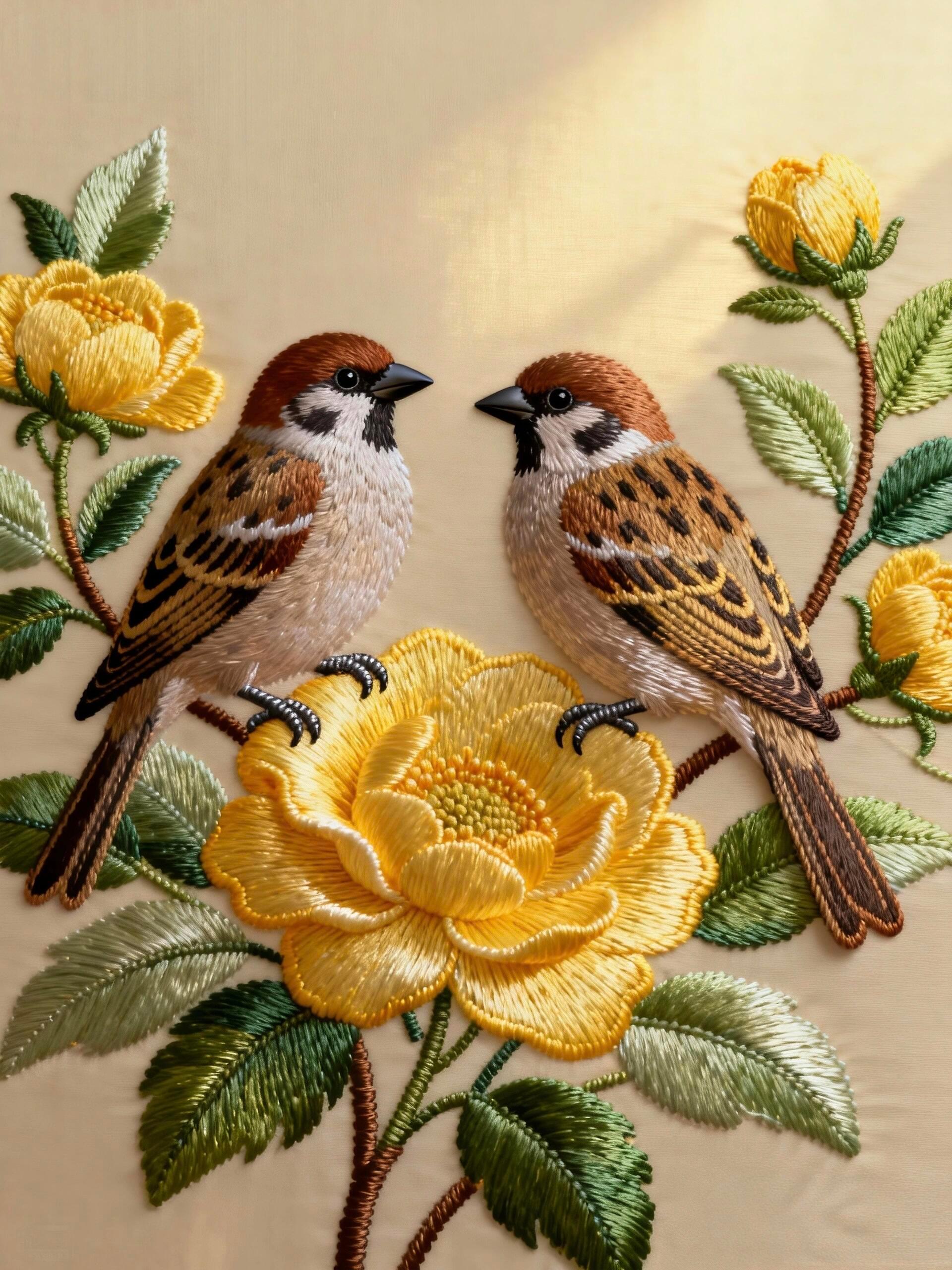 绣面上的黄牡丹娇艳饱满,绒感十足,就像春日里刚刚绽放的花朵,带着清甜温柔的气息。一旁两只雀鸟栩栩如生,灵动有神,眼波流转间,好似在彼此低语说悄悄话。