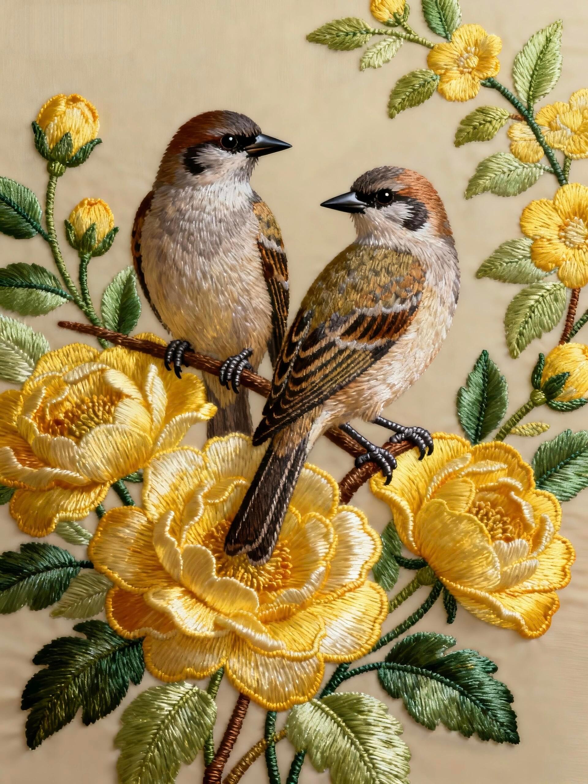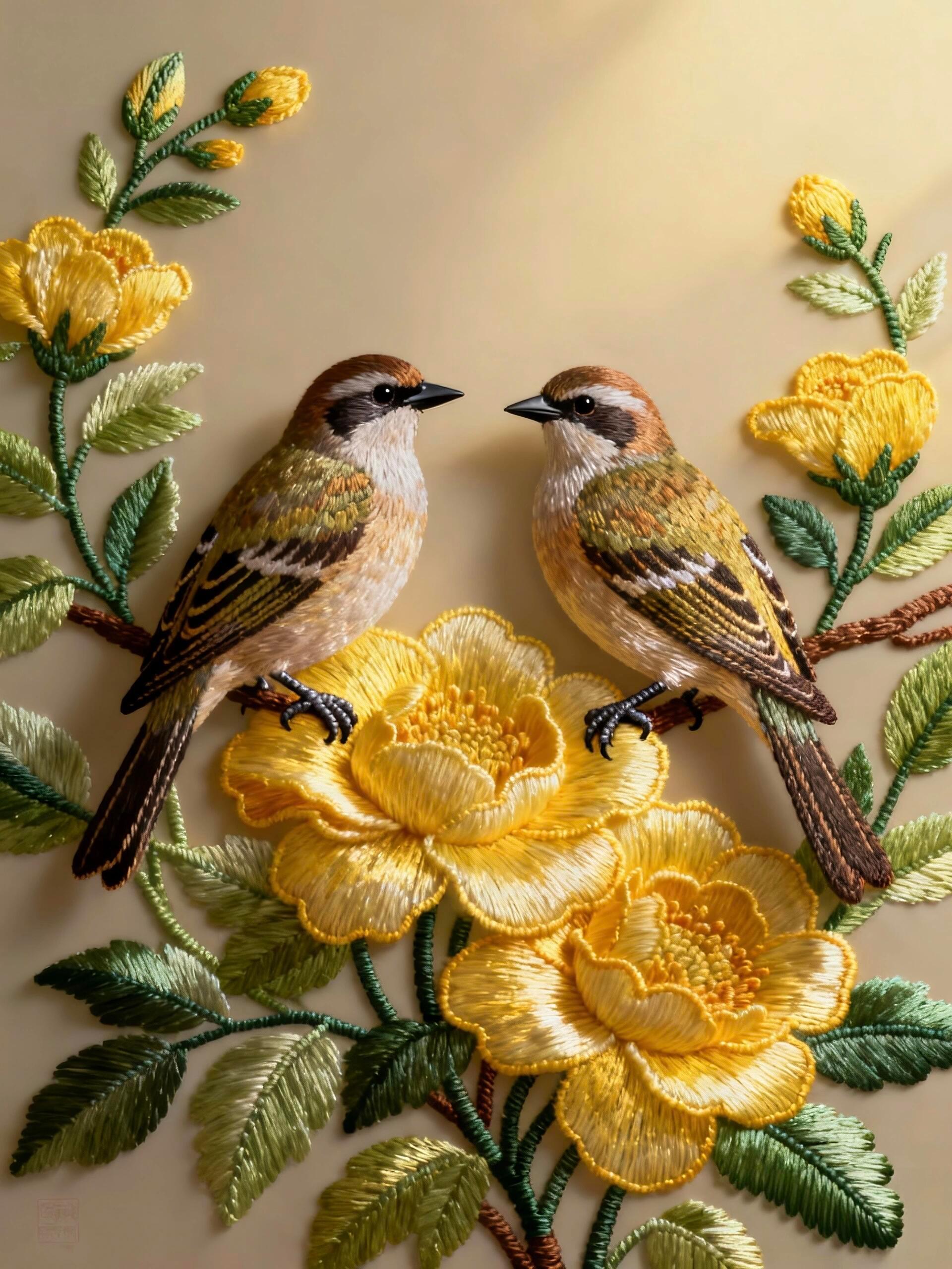 丝线自带温润柔光,细腻又有质感,就连雀鸟身上的羽毛纹路都根根分明,层次清晰可见,一针一线都尽显细腻匠心。整幅作品温柔雅致,春意盎然,软乎乎的质感扑面而来。