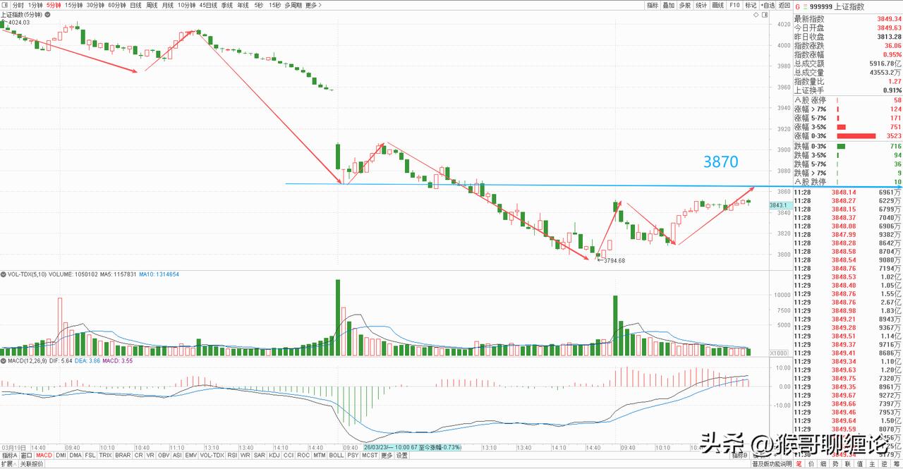 上午大盘高开低走又回升,说明已经有资金开始尝试入场,不过做多动能并不强劲,上午也仅仅维持在开盘点位,并没有明显上攻的动作,同时量能也没有放大,仅仅只能看作是一个反抽动作。在没有封闭昨天留下的跳空缺口之前,依然维持看空局面。 从5分钟图上看,这里已经开始走上涨结构,但从MACD红柱可以看出,上涨力度还是比较弱,下午就看能否进一步向上冲击,去考验3870点附近的压力,只要突破这个位置,就能升级为30分钟级别的上涨,同时也能带动日线级别止跌。
