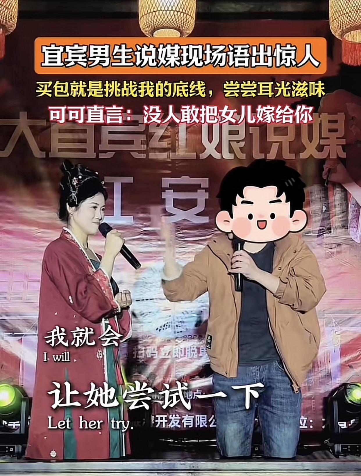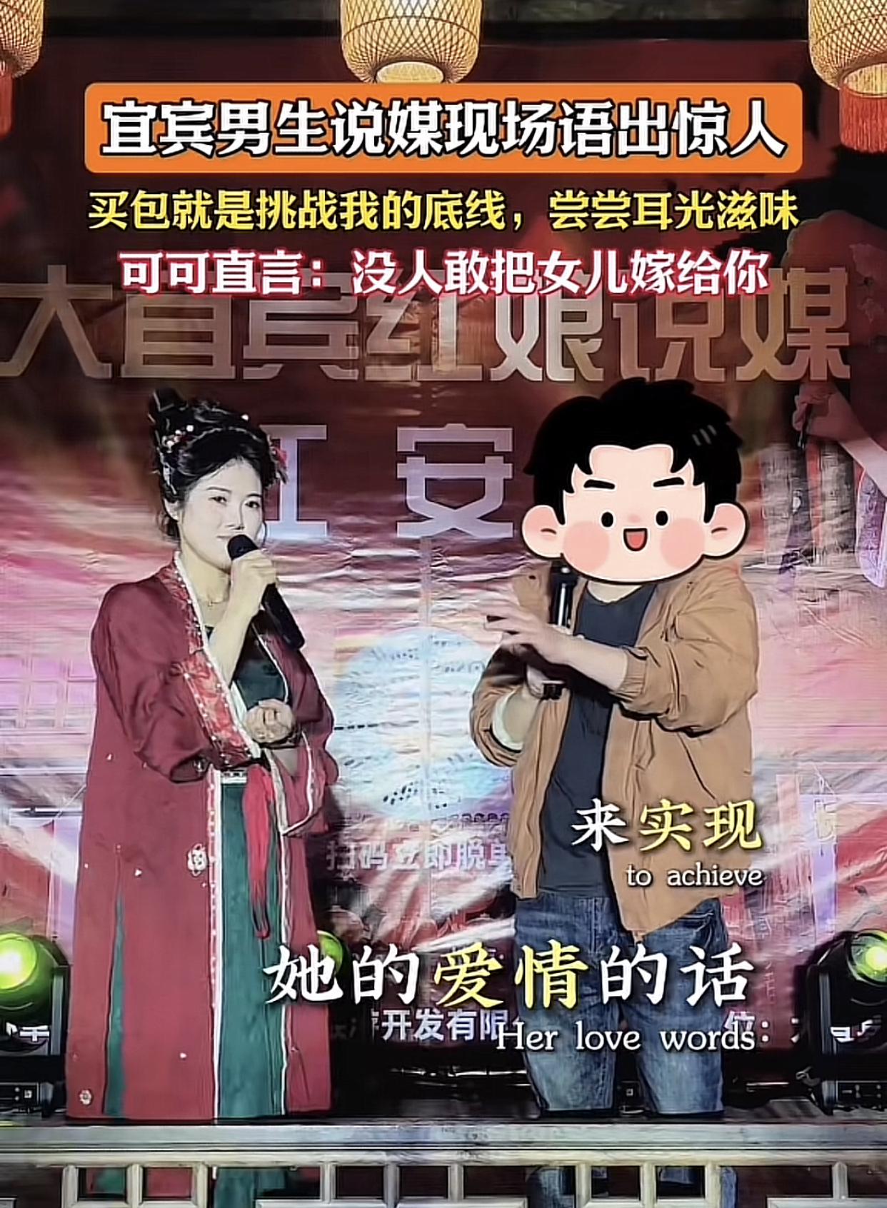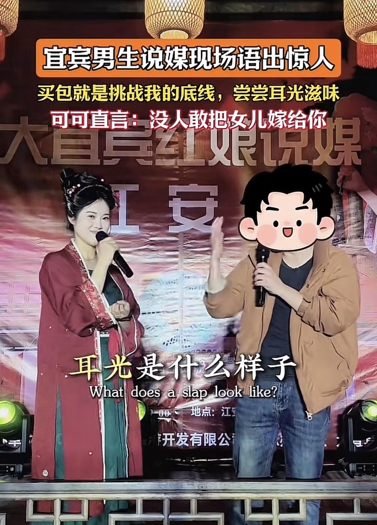 又在幻想一个不存在的人花他不存在的钱,女朋友还没出现就已经欠bro一个大嘴巴了。 刷到四川宜宾举办的户外相亲局,嘉宾轮流上台自我介绍说出择偶条件,台下嘉宾有心动的可以上台接触认识。 现场气氛刚烘托到位,这时一位bro自信满满的上台,然后表示自己不喜欢太过物质的女生,底线是不可能给未来女朋友买包,如果女朋友让他给她买包来实现她的爱的话,他就会让尝试一下耳光是什么样子。 bro语气中没有一丝调侃,全是得意和兴奋,一边说一边还在不断的展示他的手掌,那样子仿佛恨不得马上随机从台下拉个人上来演示一番。他似乎觉得这样就能得到一个乖巧听话的女朋友。 女主持人听完他的话后顶冒问号,随后告诉bro说这里不提倡家bao。但这bro却反驳说:“这不是家bao,主要是她在挑战我的底线”。家bao就家bao,还找什么理由?女朋友都没有就开始虚空索敌,幻想一个不存在的女朋友花他不存在的钱。 最后连主持人都无语了。让不要开玩笑了,然后直言:“这一句话说完,现场还有谁敢把闺女嫁给你?”。 bro,你不会以为自己很帅吧?果然那句话说的很对:不要花穷男人的钱,因为他们会急得跳脚。