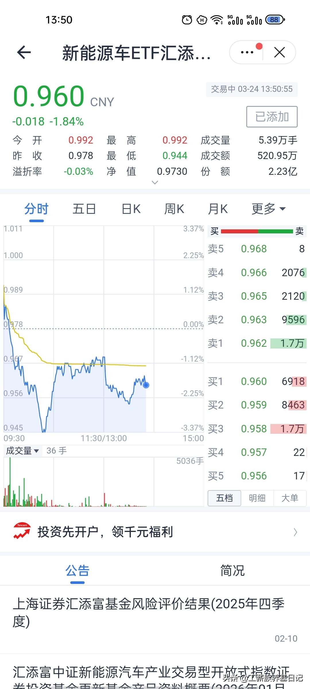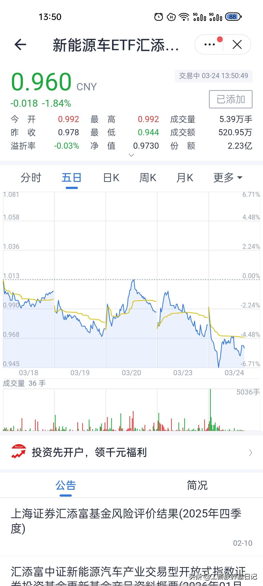 新能源车持续回调,现阶段该躺平还是操作? 新能源汽车板块今日延续弱势走势,跌幅近1.84%,价格在0.960元附近,近五日累计调整幅度已超5%,短期均线全部失守,量能较昨日有所萎缩,下方临近前期低点0.939元支撑位,整体呈现明显的短期弱势震荡格局。在我看来,这波连续调整大概率和市场资金轮动、短期情绪偏弱有关,叠加板块自身处于相对低位磨底阶段,走势上也就显得持续承压。 我个人目前依旧保持原有仓位不动,既没有在这个位置选择割肉离场,也没有着急加仓抄底,继续按照自己之前的节奏耐心持有。我始终觉得,新能源这条赛道的大方向并没有发生改变,短期更多是情绪和资金带来的波动,没必要因为几天的下跌就乱了节奏。 接下来我也会继续观察盘面走势,等待更明确的企稳信号再做后续打算,不追涨也不盲目接飞刀,安安稳稳拿着,用时间去换空间,对我来说就是现阶段最适合自己的方式,大家觉得新能源还要磨多久才能迎来反弹?