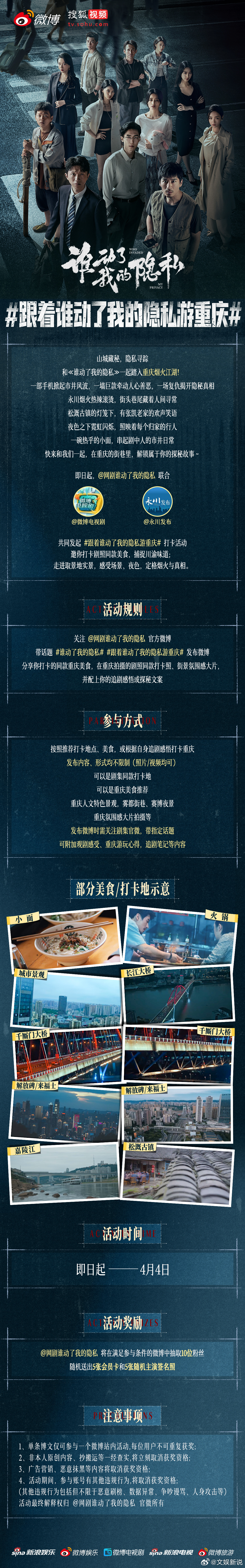 网剧《谁动了我的隐私》取景地曝光,想直接订去重庆的票!重庆永川的烟火气、松溉古镇的灯笼、解放碑的霓虹...每一帧都美到想截图当壁纸!现在官方还搞了打卡活动!带话题跟着谁动了我的隐私游重庆谁动了我的隐私 参与就有机会赢得福利!朋友们快来!