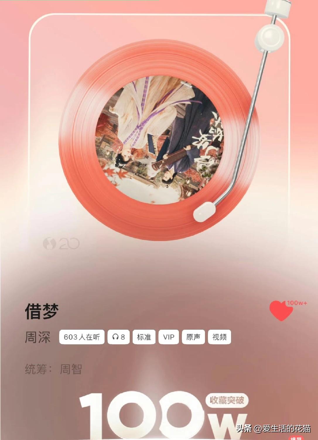 又一首百万收藏!周深《借梦》又在QQ音乐拿到百万收藏了! 深深空灵的嗓子,真是把那种跨越宿命的深情唱得特别动人。好多人都说这首歌成了循环播放的心头好,我也一样,听着听着就停不下来。 从上线到现在攒到这个数字,靠的就是歌声本身的力量吧,好作品自己会说话,听众的耳朵最诚实。