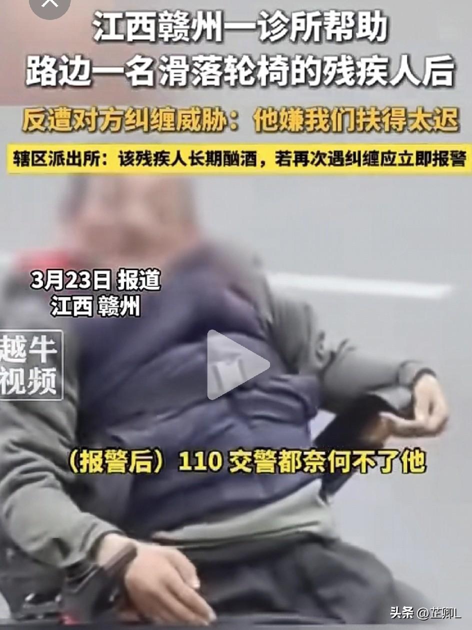真让人寒心!江西诊所好心扶轮椅男子,反被赖上威胁:你店别想开了! 3月22日,江西赣州宁都县翠微西路,一家诊所摊上了糟心事! 诊所老板陈女士说,当时丈夫在坐诊,看到路边机动车道上,一名残疾男子从轮椅上滑下来,赶紧让诊所经理去扶。担心被讹,还特意全程开手机录像。 就七八米远的事,医生忙着接诊,已经第一时间派人帮忙了。结果倒好,男子被扶起来后,居然张口就嫌扶得太晚。 没过几分钟,居然还冲进诊所大吵大闹,胡搅蛮缠,还放狠话威胁,说诊所不尽责,让要店开不下去! 好好做善事,反倒被倒打一耙,诊所气得直接报警。 3月23日警方通报来了:这名残疾人长期酗酒,事发时就是酒后无理取闹!民警也说了,再被纠缠,马上报警! 真是好人难做啊!全程录像都防不住这种无赖,以后谁还敢随便伸手帮忙? 这样的无赖,难道就不怕以后大家都知道他的行径了,他再有点什么意外,没人再愿意搭把手? 支持诊所硬刚到底,绝不惯着这种讹人行为! 素材来源:新晚报,侵联删!
