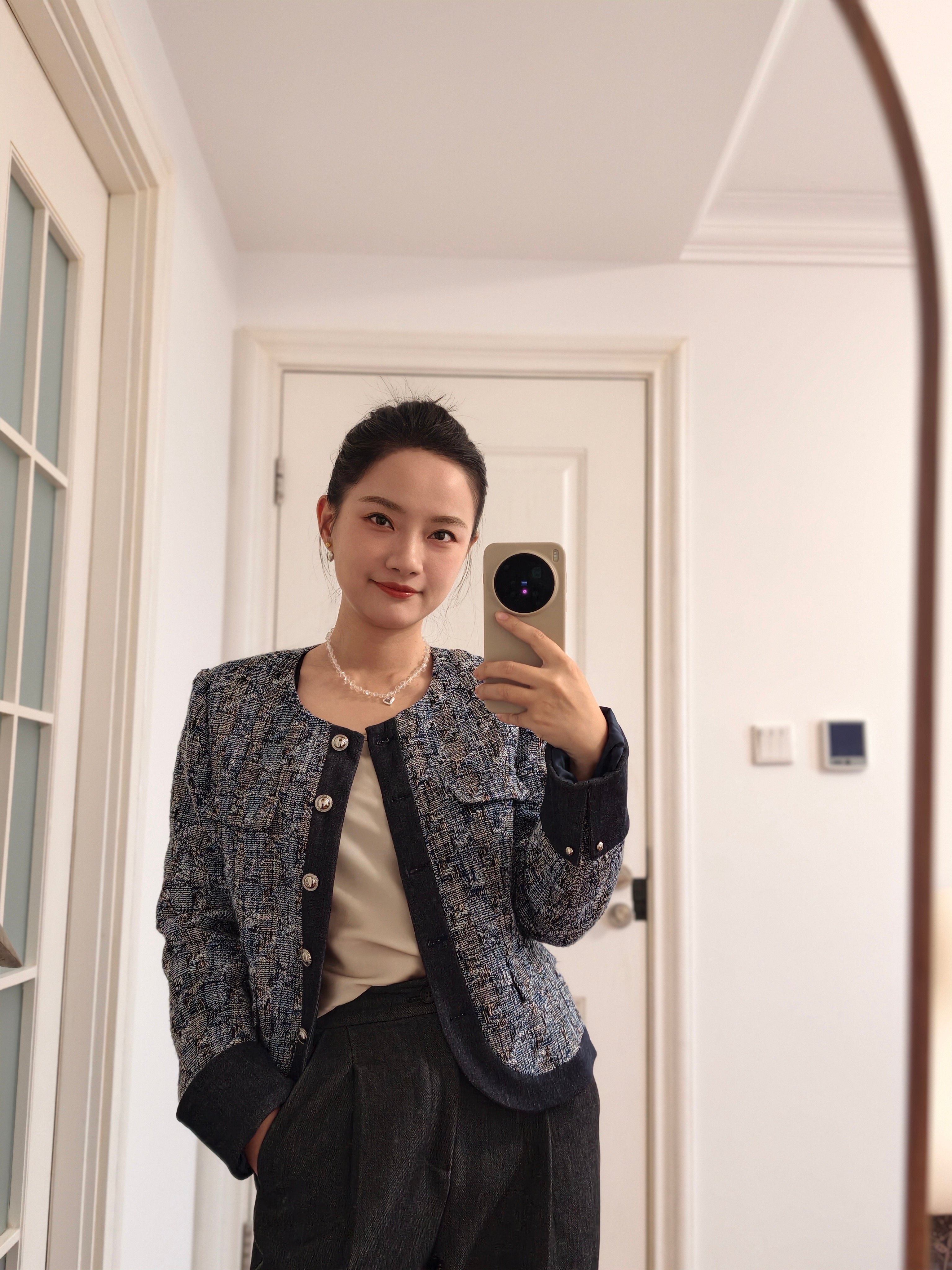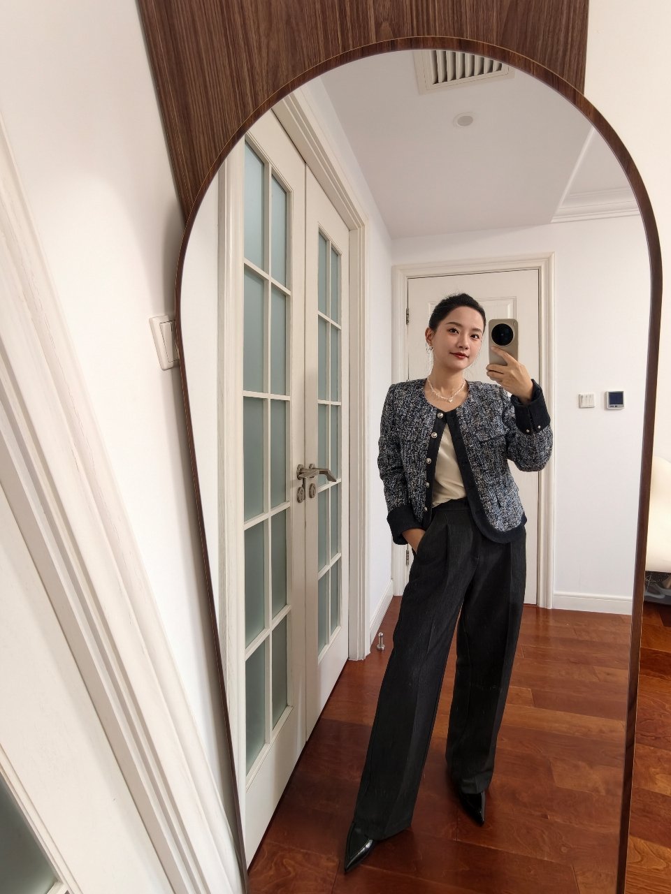 今天练习对镜自拍,全是技巧没有感情 全身镜头调到0.6广角,镜头微微朝下,两腿分开一前一后,咔嚓,大长腿就有了。
