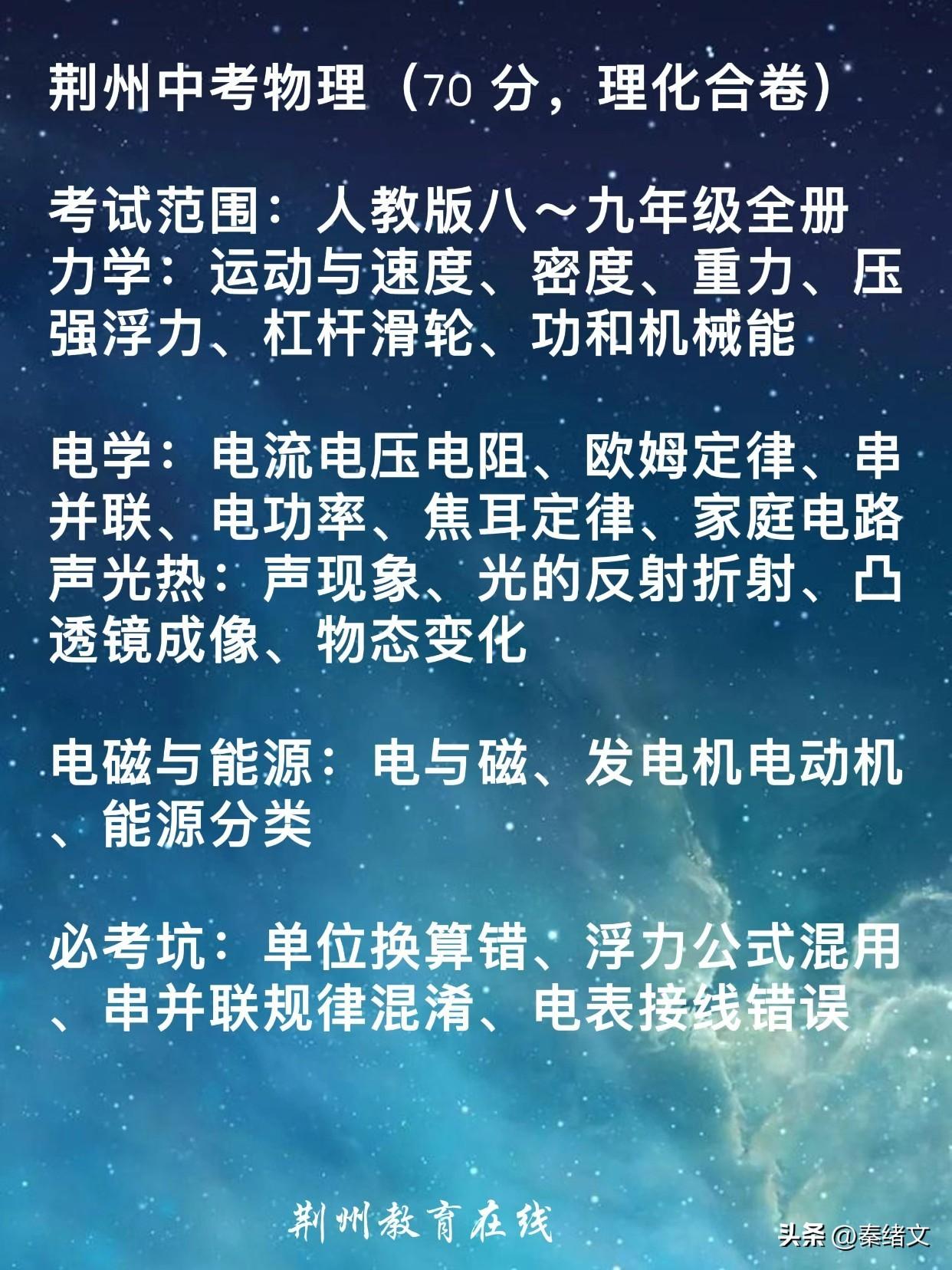 荆州中考物理,70 分,理化合卷 考试范围:人教版八~九年级全册 力学:运动与速度、密度、重力、压强浮力、杠杆滑轮、功和机械能 电学:电流电压电阻、欧姆定律、串并联、电功率、焦耳定律、家庭电路 声光热:声现象、光的反射折射、凸透镜成像、物态变化 电磁与能源:电与磁、发电机电动机、能源分类 必考坑:单位换算错、浮力公式混用、串并联规律混淆、电表接线错误