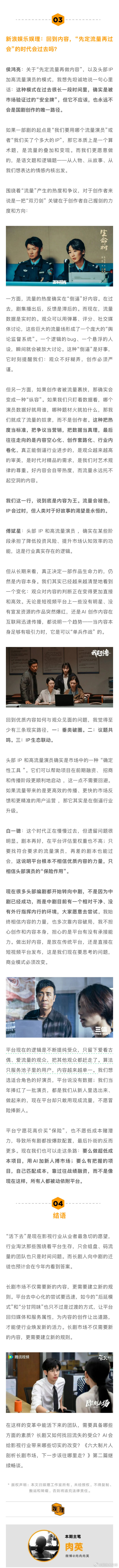 业内谈长剧先定流量再过会现象 未来演员演一个戏或许只需3天5天 侯鸿亮谈分账模式的变革,称其推动了行业从“流量导向”向“内容本位”回归。“分账模式改变的风险并非由单一主体承担,最直接承压的是制作方。平台承担的风险集中在两方面:一是内容投资与运营风险;二是规则落地的风险,数据不透明、规则不被认可,也会引发合作纠纷,影响内容供给…” 六大制片人谈长剧未来↓