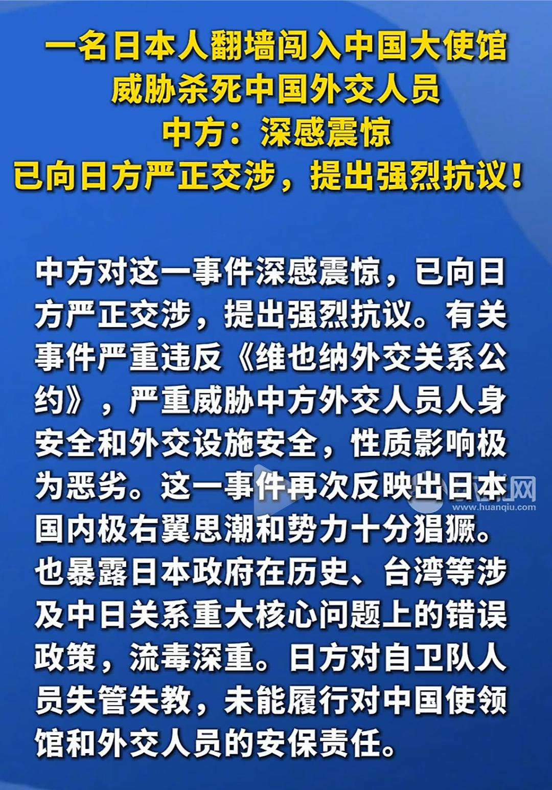 悍然闯馆威胁杀人,日本右翼猖狂至极 根据最新媒体报道,光天化日之下,竟有日本自卫队军官无视国际公法,强行翻墙,闯入中国驻日大使馆,并扬言杀害我方外交人员,性质极其恶劣,严重践踏外交尊严与人类文明底线。 中国驻外使馆是国家主权的象征,受国际法严格保护。日方本负有不可推卸的安保职责,却让暴徒轻易突破防线,公然实施威胁,充分暴露其国内极端势力抬头、安保形同虚设、监管严重失职。 此类恶性事件绝非偶然,近年来中方驻日机构多次遭扰,如今更升级为赤裸裸的死亡恐吓,背后是日本右翼反华思潮持续泛滥。 中方已提出严正抗议,敦促日方彻查严惩、加强防护,杜绝再犯。国家尊严不容挑衅,外交人员安全不容侵犯。任何危害中国利益的恶行,必将遭到坚决回击,付出应有代价。 日本军事挑衅 东京中国人遭袭 日本想再侵略 日本暴力事件 日本要侵略中国 日本涉华言论 无下限日本人