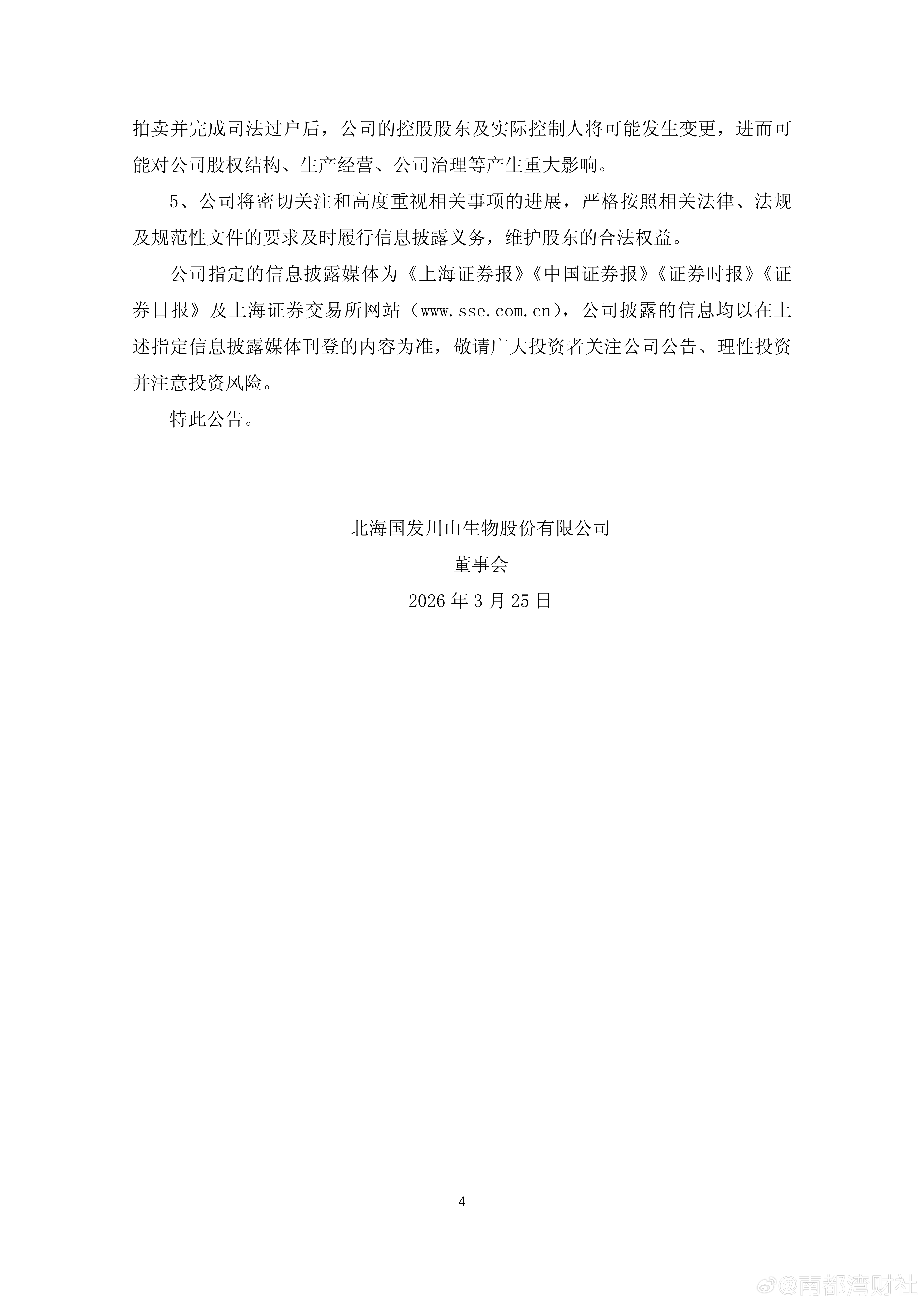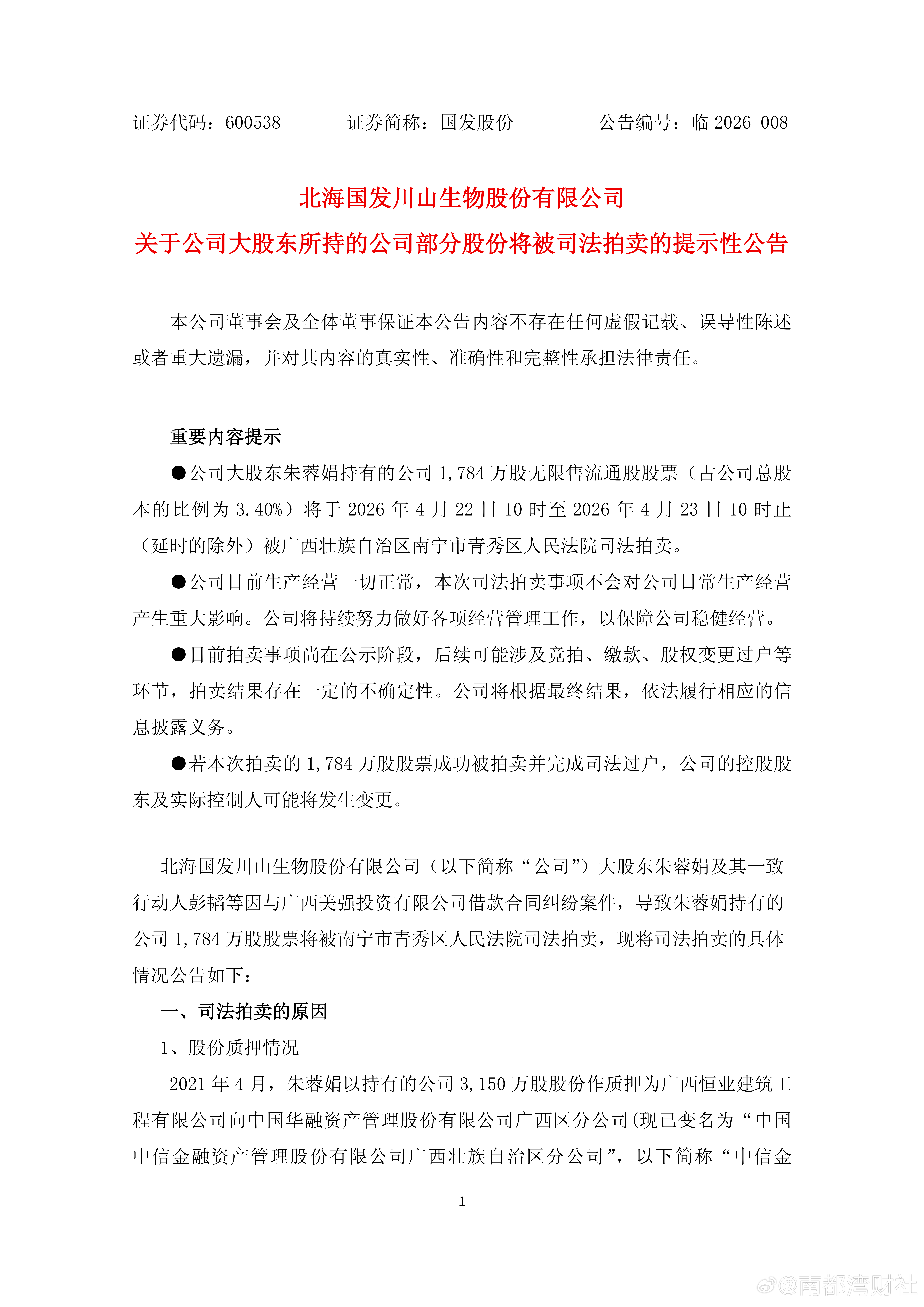 【#国发股份大股东朱蓉娟1784万股将被司法拍卖#,实控人生变?】3月24日,国发股份(600538.SH)公告称,公司大股东朱蓉娟及其一致行动人彭韬等与广西美强投资有限公司的借款合同纠纷案件,导致朱蓉娟持有的公司1784万股股票(占公司总股本的3.4%)将于4月22日10时至23日10时止(延时的除外)被南宁市青秀区法院司法拍卖。公司大股东及其一致行动人目前股份被司法冻结的比例较高,最近一年内因债务问题涉及的执行案件较多、金额较大。若此次拍卖的1784万股股票成功被拍卖并完成司法过户后,公司的控股股东及实控人将可能发生变更。(公司公告)