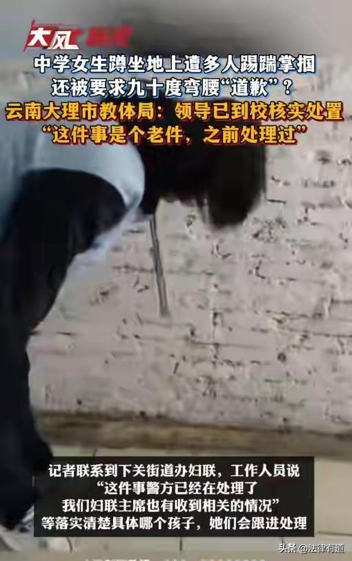 3分钟视频里的“弯腰道歉”:当校园欺凌遇上新法,年龄不再是“护身符”。 近日,一段长达3分钟的视频在网络上疯传,刺痛了无数人的神经。画面中,一名身着水蓝色校服的中学女生无助地靠墙蹲坐在地上,周围至少围着五六名同龄人。等待她的不是同学的友爱,而是接连不断的踢踹、掌掴和刺耳的嘲笑声。 更令人愤怒的是,施暴者在发泄完暴力后,竟要求被打女生起身,以九十度弯腰的姿态向她们“道歉”。而那名被打的女孩,始终低头不语,不敢反抗。 这一幕并非电影情节,而是真实发生在云南大理市下关四中正阳校区的校园欺凌事件。 据媒体消息,视频中的受害女生系大理市下关四中正阳校区的学生。令人唏嘘的是,她的父母并非第一时间从学校或施暴者口中得知此事,而是直到最近这段视频在网络上广泛传播,他们才看到了女儿遭受的屈辱。 视频显示,施暴者中既有男生也有女生。受害者被逼至墙角,遭受连续踢踹和掌掴,现场人员不仅没有制止,反而发出阵阵笑声。最终,在施暴者的要求下,受害者被迫九十度鞠躬“道歉”,这无疑是对其人格尊严的进一步践踏。 目前,随着舆论发酵,当地警方及教育部门已迅速介入。紫云派出所表示已关注并介入调查;大理市教体局相关负责人已全部到校开展核实处置工作;下关街道办妇联也表示,待核实清楚具体孩子信息后,将跟进处理。 @法律有道 又是一起未成年人校园霸凌案件,“未成年”不应再是霸凌的挡箭牌。 面对这起令人气愤的事件,公众最关心的问题是:这些施暴者会得到应有的惩罚吗?他们能否再次以“未成年人”的身份逃避法律制裁? 1、新的《治安管理处罚法》让校园欺凌正式“入法”。 2026年1月1日,新修订的《中华人民共和国治安管理处罚法》正式施行。其中最受关注的一点是:首次将校园欺凌明确纳入治安管理处罚范畴。 这意味着,像视频中出现的“殴打、侮辱”等行为,不再是学校内部可以“私了”的违纪行为,而是触犯了国家法律的违法行为。公安机关有了明确的法律依据直接介入调查和处理,学校若隐瞒不报,相关责任人也将被追责。 2、拘留年龄与条件:打破“年龄护身符”。 在过去,对于已满14周岁不满16周岁的未成年人,即便违反治安管理,也往往“不执行行政拘留”,导致部分施暴者有恃无恐,甚至叫嚣“未成年不怕抓”。 然而,根据2026年新施行的法律,这一情况已被修正: 首先是已满14周岁不满16周岁的未成年人,如果在一年内两次以上违反治安管理,依法执行行政拘留。 其次是已满14周岁不满18周岁,初次违反治安管理但情节严重、影响恶劣的,也依法执行行政拘留。 在这起大理校园欺凌事件中,施暴者不仅实施了殴打,还伴有侮辱性行为(强迫道歉),且视频在网络广泛传播造成了极其恶劣的社会影响,完全符合新法规定的“情节严重、影响恶劣”的情形。法律已经明确传递出一个信号:年龄不再是违法犯罪的“免罚金牌”。 3、法律发挥组合拳:民事赔偿与矫治教育。 除了治安处罚(行政拘留、罚款),施暴者及其监护人还逃不掉 “民事责任” 。根据《民法典》,未成年人造成他人损害的,由监护人承担侵权责任。受害者有权主张医疗费、精神损害赔偿等。 此外,对于未达刑事责任年龄或虽达年龄但情节较轻的,法律也设计了 “矫治教育” 措施,如送入专门学校接受教育、心理辅导、行为矫正等。最高人民法院也在2026年发布的《审理涉未成年人民事案件工作指引》中强调,要将预防违法犯罪贯穿于案件审理全过程,做实家庭教育指导。 “他还是个孩子”这句话,曾无数次成为欺凌者逃避责任的借口。但从2026年开始,法律已经明确拒绝为这种借口买单。法律不仅是惩戒,更是一种教育。 它告诉所有未成年人:你可以成长,但你必须学会敬畏规则;你可以犯错,但你必须为自己的行为负责。