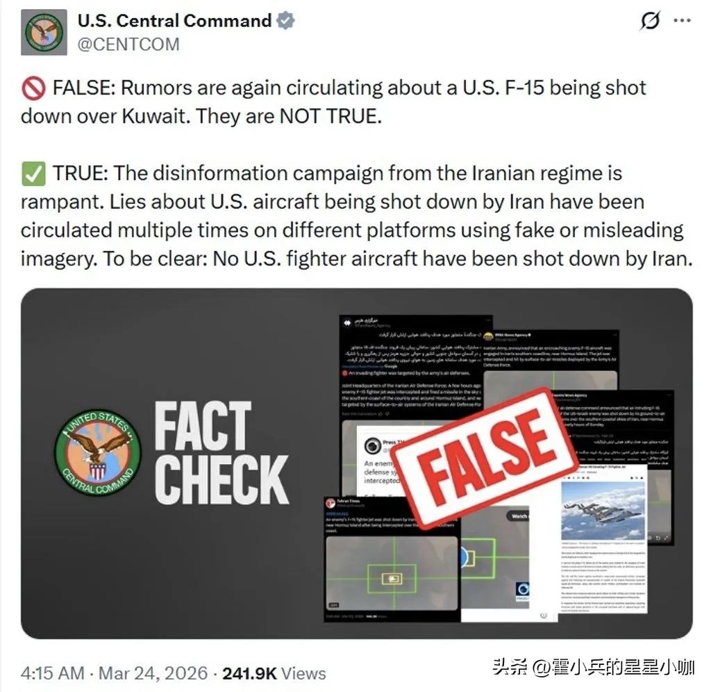 🚫 谎言:关于美国F-15战斗机在科威特上空被击落的谣言再次甚嚣尘上。这些谣言并非真相。 ✅ 真相:伊朗政权的虚假信息行动十分猖獗。关于美国飞机被伊朗击落的谎言在不同的平台上被多次大肆传播,并配以虚假或具有误导性的画面。我们要明确地说:没有任何一架美国战斗飞机被伊朗击落。 那么问题来了:美国战斗飞机是被谁击落的?
