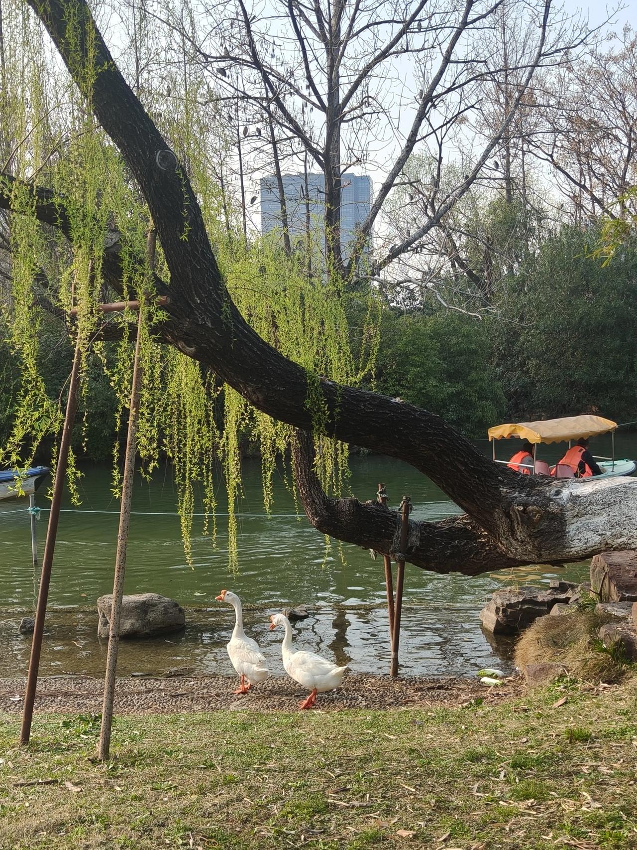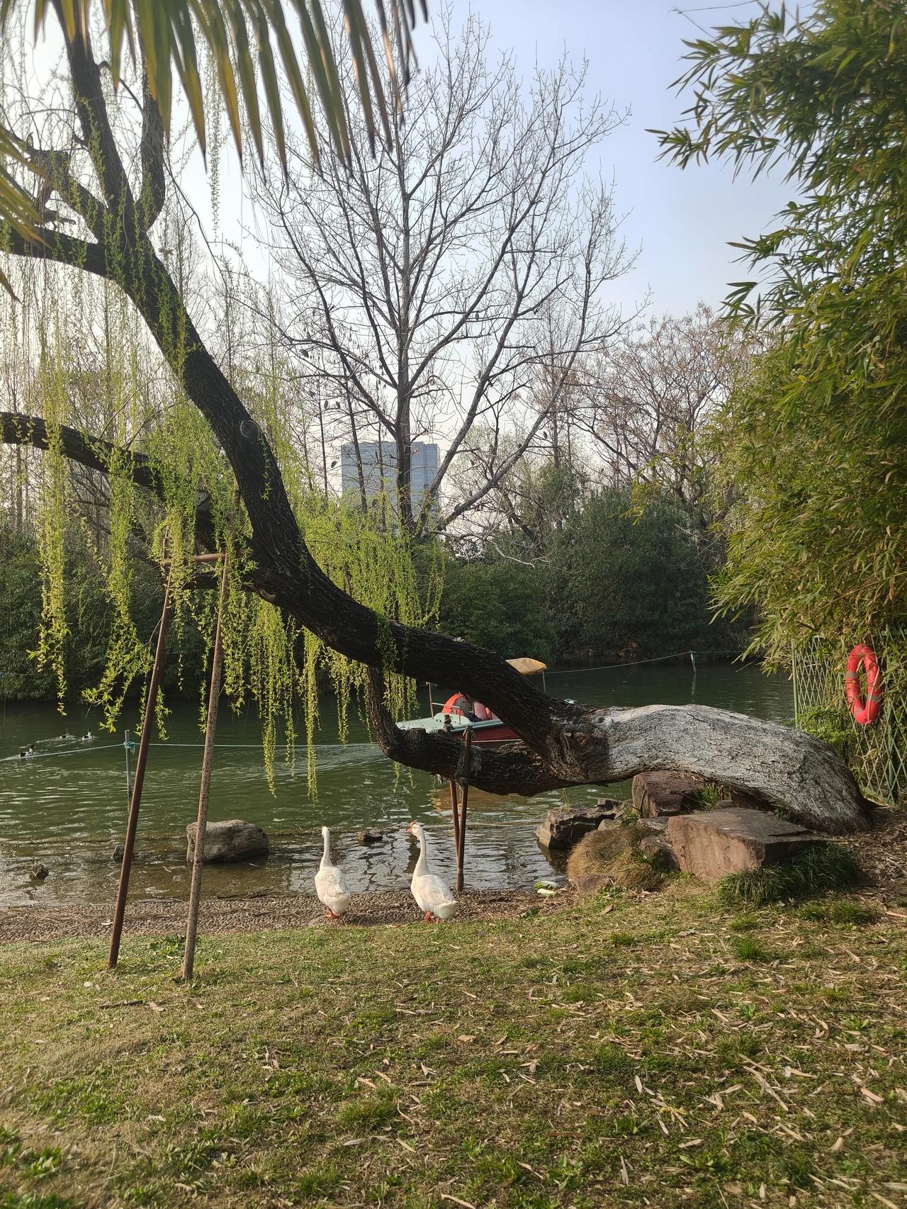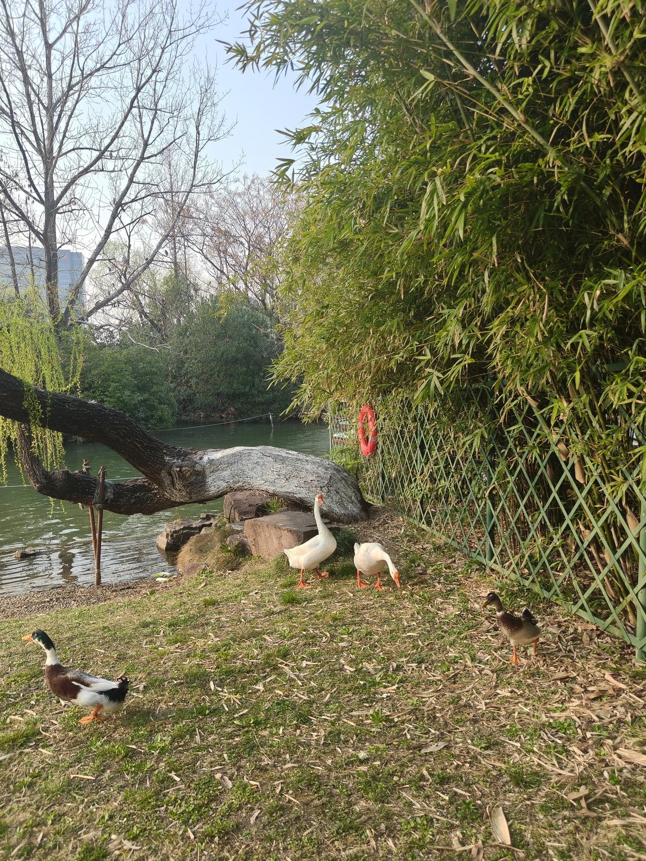 大宁灵石公园赏花随手拍实景图分享! 柳树下竹林旁的小鸭子🦆和大白鹅🪿🪿 红叶李,郁金香🌷还有那个蓝色 小花花∠※叫~粉蝶花🌸 又叫~婴儿蓝脸,是不是挺形象哈~[捂脸]