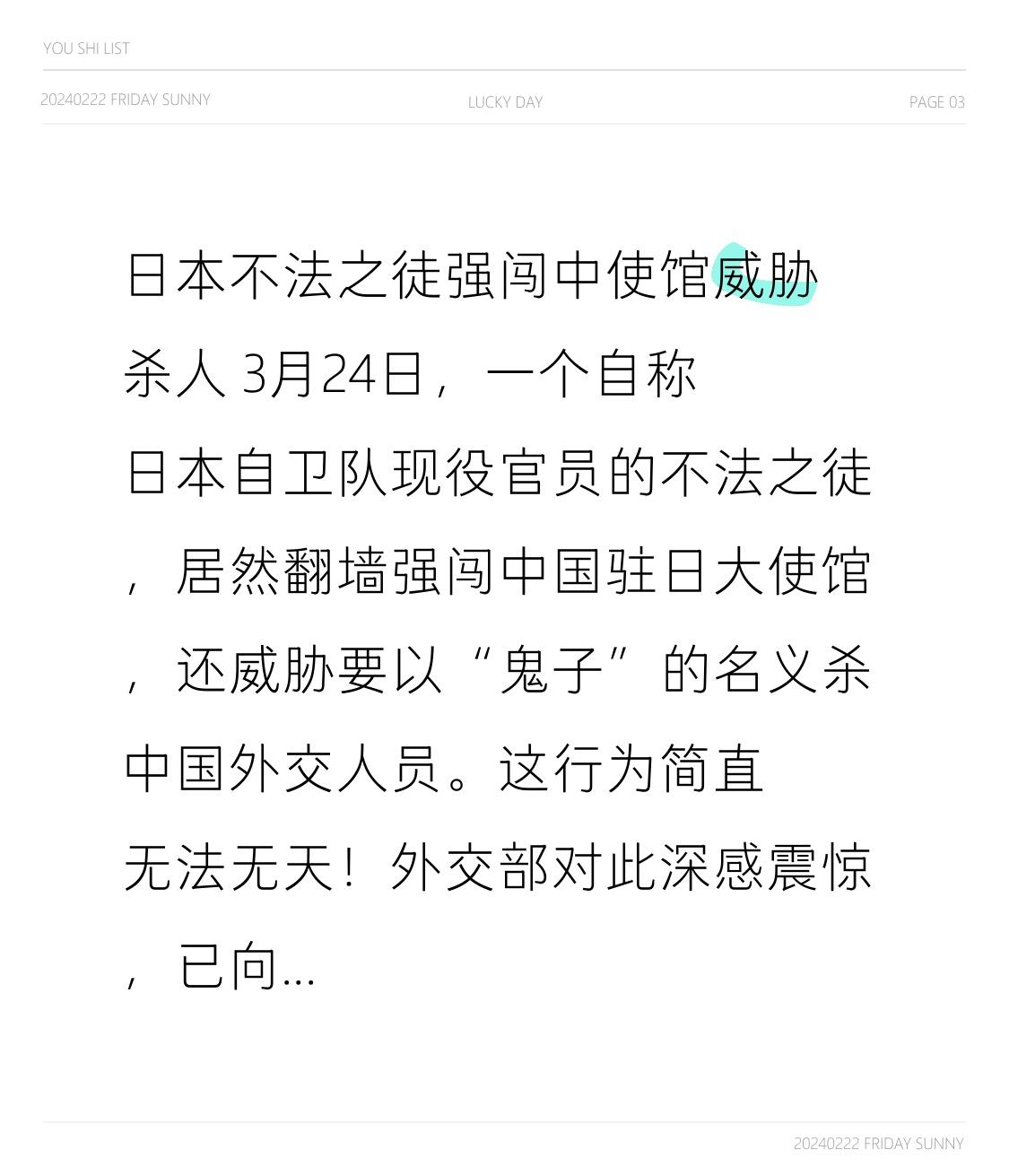 日本不法之徒强闯中使馆威胁杀人 3月24日,一个自称日本自卫队现役官员的不法之徒,居然翻墙强闯中国驻日大使馆,还威胁要以“鬼子”的名义杀中国外交人员。这行为简直无法无天! 外交部对此深感震惊,已向日方严正交涉、强烈抗议。这事儿严重违反《维也纳外交关系公约》,威胁中方外交人员和设施安全,性质恶劣。这也反映出日本国内极右翼思潮猖獗,“新型军国主义”成患,日本政府在核心问题上的错误政策流毒不浅。希望日方赶紧彻查严惩,给中方一个交代,别再让这种破事儿发生!