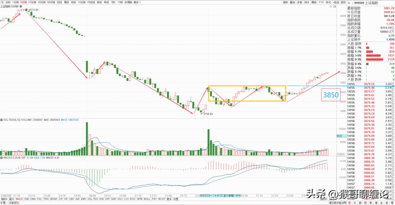 大盘今天高开高走,缩量上涨,算是给下跌踩了一个刹车,整体市场超5000家上涨,和昨天形成了鲜明对比,也算是给昨天坚定持有的一个甜枣,但并不代表市场确认止跌,一方面量能大幅萎缩,说明做多动能并不强劲,另一方面在没有封闭上方缺口之前,依然处于空头主导的局面。当然这时候也是检验我们手里持仓的时候,快速反包修复才是强者恒强,去弱留强。 从5分钟图上看,中午我们给出一个关键位置3870点,下午也算是完成突破,正式升级为30分钟级别的上涨,同时这里也构建完成了一中枢上涨结构,后面只要不破中枢上沿3850点,短线反弹就不会结束。反之,还要再度寻底。