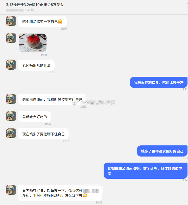 其实这样挺好的,这是她追求更好自己的表现!我实盘有很多朋友,在老方的实盘赚到qian之后并不是毫无节制的挥霍,因为这只是物质层面的快感,是短暂且肤浅的,刚开始可能比较吸引人,不过越到后面他们越会想办法去提升自己,例如精神层面提升认知,接受文化熏陶!身体层面呢,他们会时常保养并坚持运动,这都是积极向上的表现。