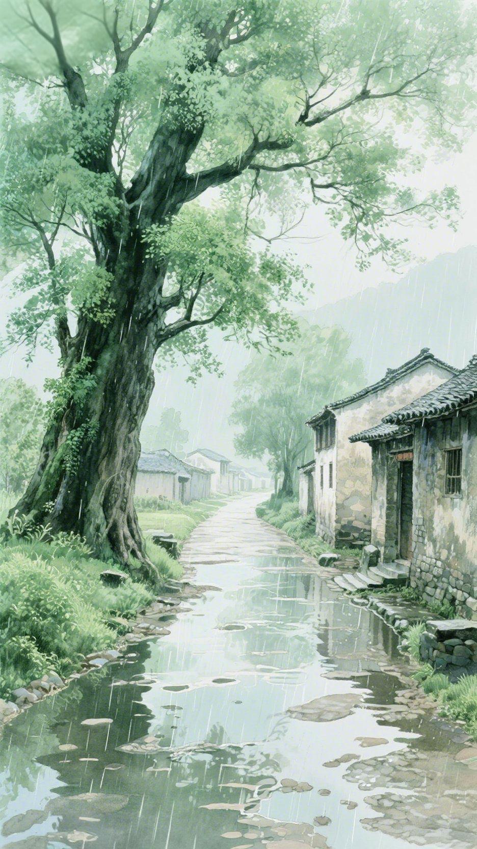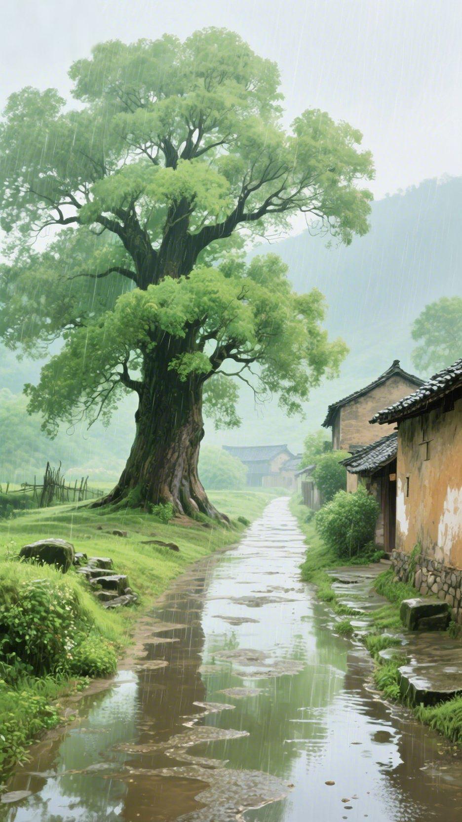 《雨浸旧村巷》 雨丝斜斜织进老巷,青石板路浸成墨色的镜——老槐树垂着沾露的绿,苔藓在树纹里洇开湿意,雨珠砸在水洼里,碎成一捧轻晃的云影。 土坯墙剥着岁月的黄,木门半掩着旧时光,电线在雾里牵起细弦,远山是浸软的绿团。风裹着雨的凉,裹着草叶的腥甜,裹着老巷里不紧不慢的呼吸——像奶奶摇着蒲扇说的从前,连时光都浸得温软。 此刻站在巷口,雨落满身,却觉心里是被泡软的暖。 雨巷旧时光 治愈乡村雨
