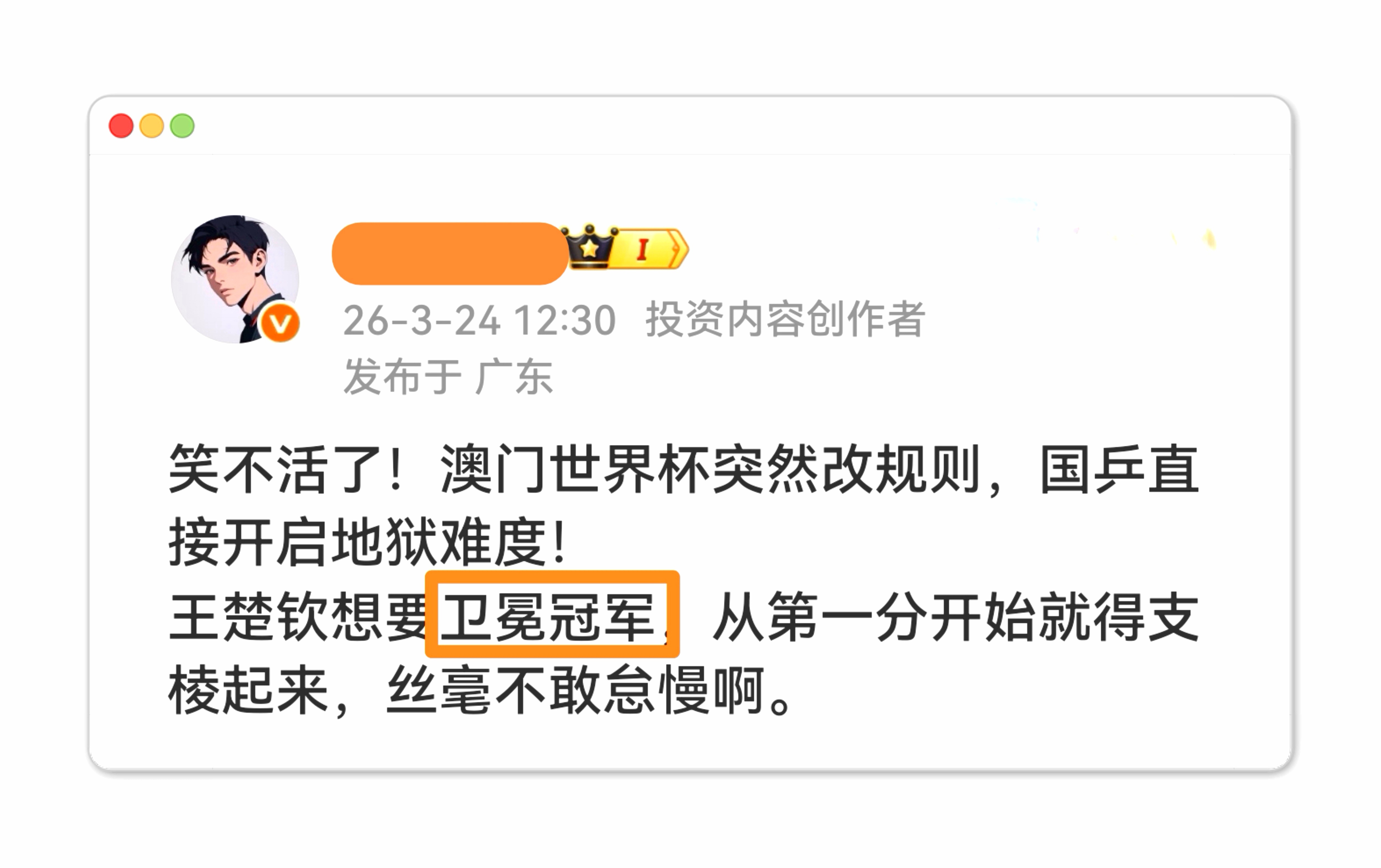 无冕之人,何来卫冕?!卫冕的前提是得有冕。一个世界杯冠军都没有的人,就别硬蹭了吧。国乒首位淘汰制大力整治体育饭圈乱象