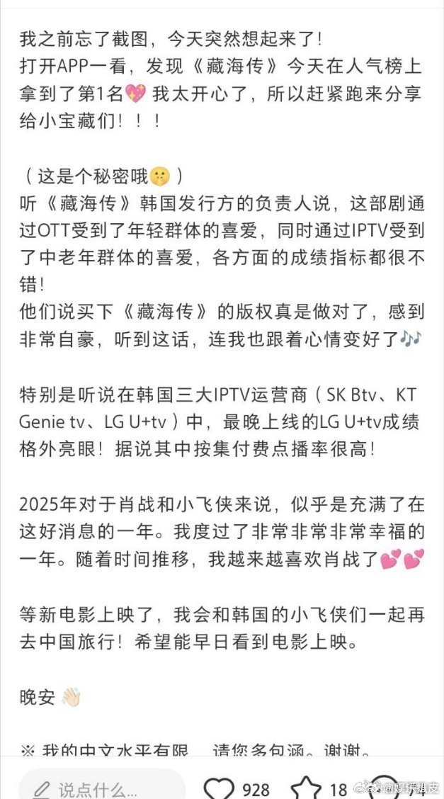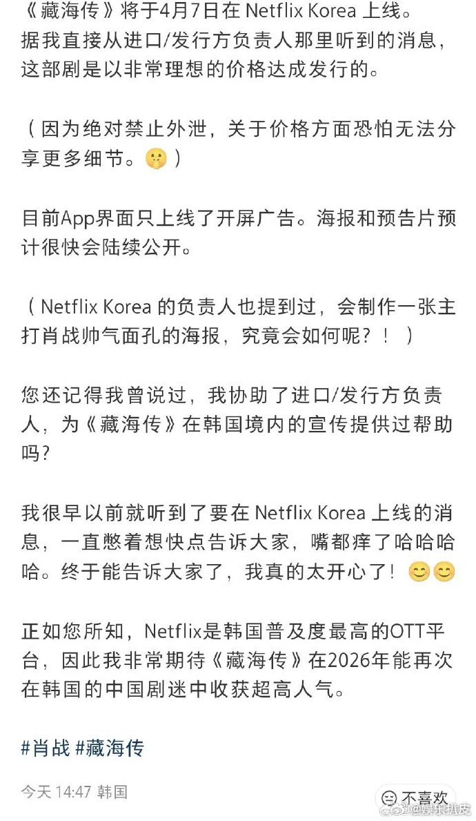 藏海传将在韩国Netflix上线藏海传登陆韩国Netflix肖战《藏海传》继去年在Disney+同步独播之后,马上要上线韩国Netflix!国剧之光藏海传牛逼全球现象级大爆剧的含金量持续飙升🔝