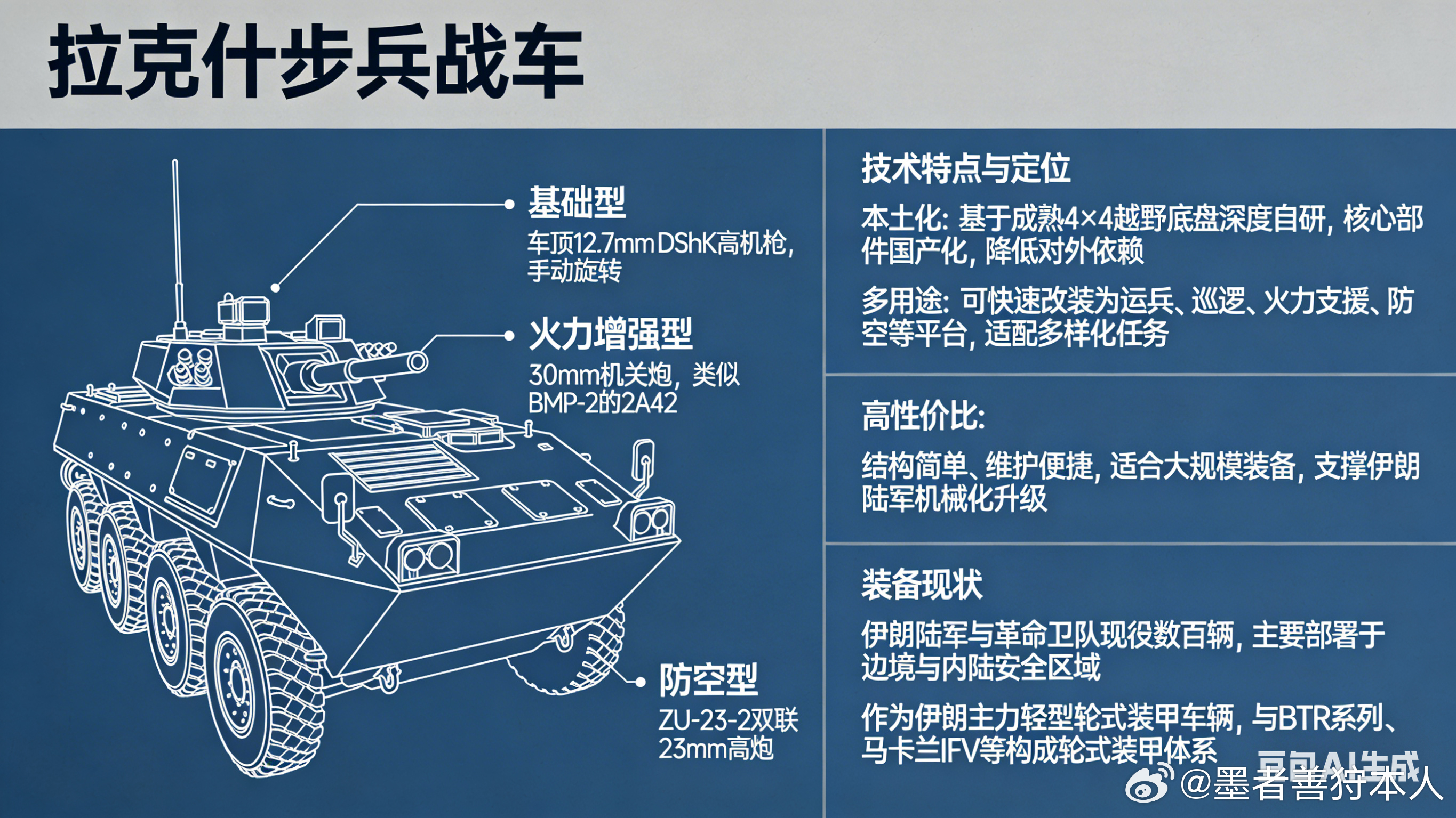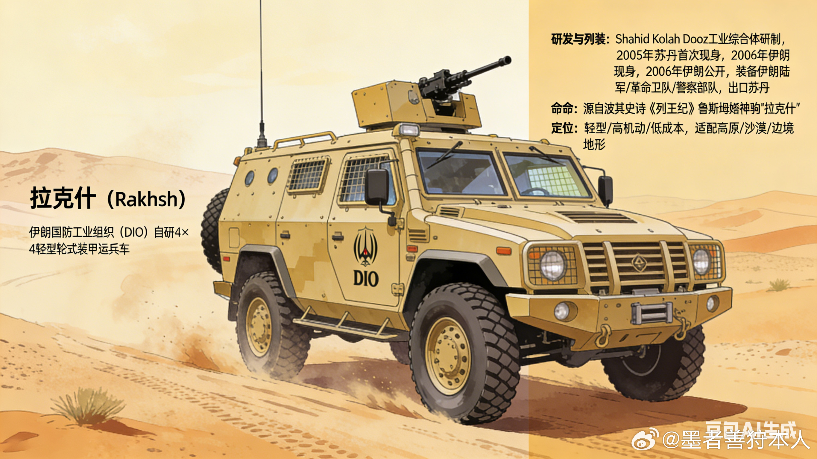 军事Ai新视野美伊以冲突 拉克什是伊朗国防工业组织(DIO)自研的4×4轻型轮式装甲运兵车,定位多用途机动平台,兼顾人员输送、边境巡逻与低烈度作战,命名源自波斯史诗《列王纪》中英雄的神驹,自带硬核底蕴✨