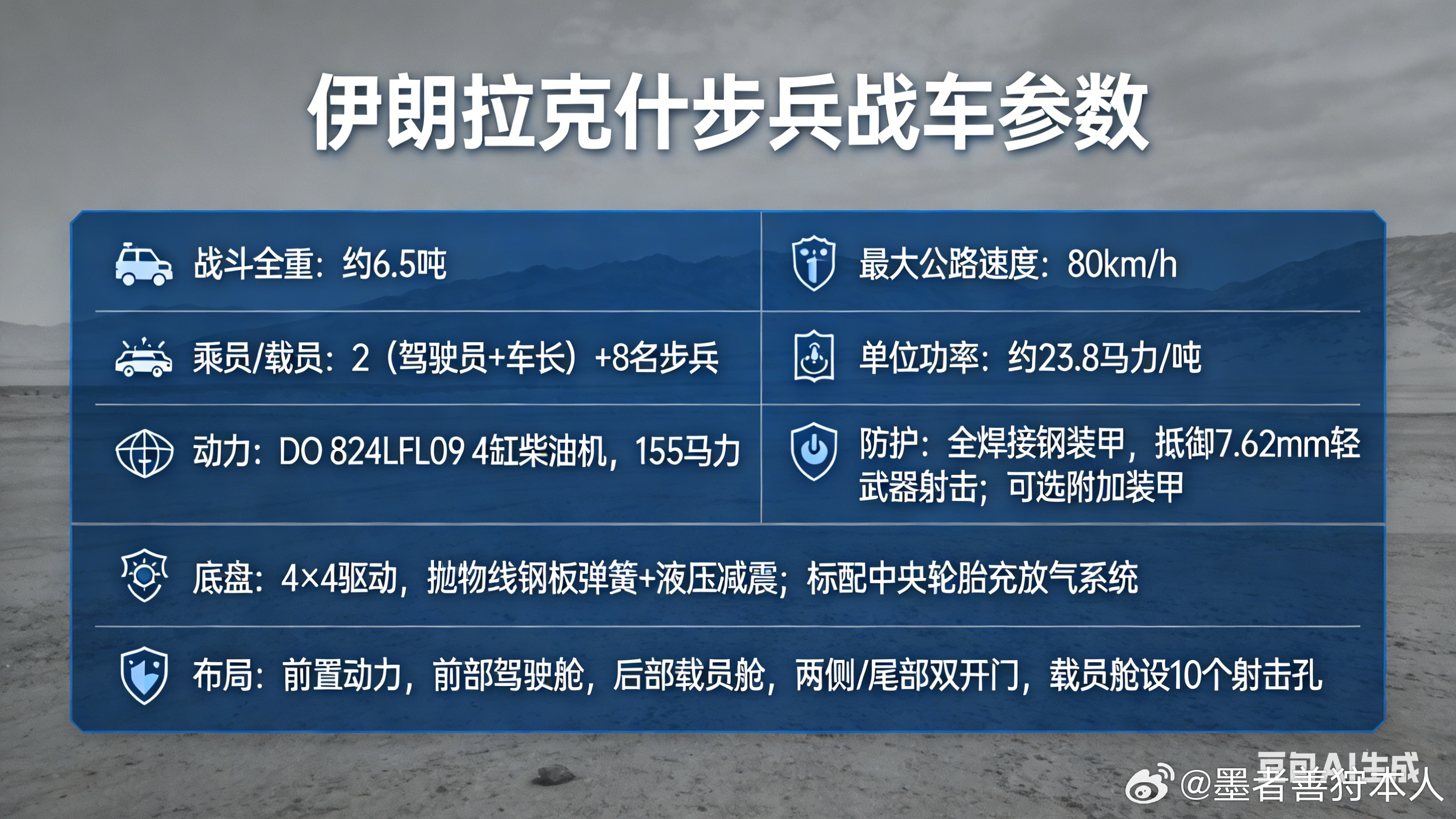 ✅ 核心亮点:战斗全重约6.5吨,可载2乘员+8步兵;155马力柴油机,最大公路速度80km/h,适配高原沙漠地形;3种火力版本,防护可达7.62mm轻武器抵御。