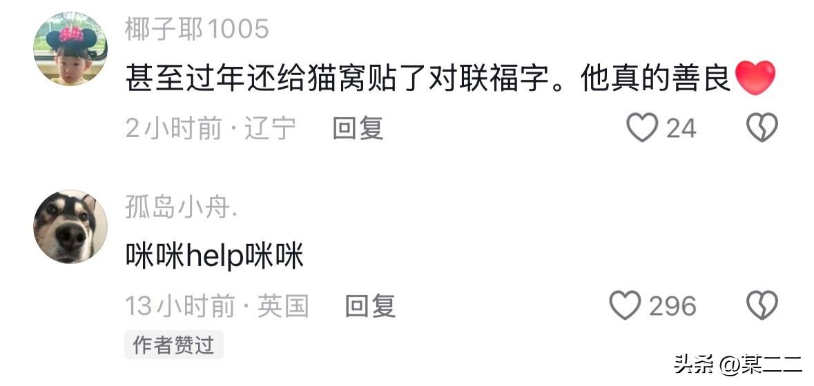 心软软,刚知道肖战在锦州拍摄新剧期间,为酒店地库的流浪猫购置了猫窝和猫粮,甚至过年的时候还给猫窝贴了对联福字。 上天入地,恐怕再也找不到肖战这么好的人了😭善良真的从不只是说说而已,虽然小猫脏兮兮的但还是会驻足和它一起玩耍、会给它买猫窝和猫粮,看到这只猫被肖战好好爱着,才终于理解了“你要喜欢一个本身就很好的人”。