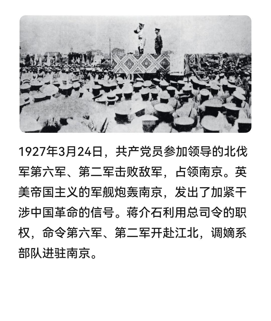#建国丰功伟绩 历史上的今天:1927年3月24日,共产党员参加领导的北伐军第六军、第二军击败敌军,占领南京。英美帝国主义的军舰炮轰南京,发出了加紧干涉中国革命的信号。蒋介石利用总司令的职权,命令第六军、第二军开赴江北,调嫡系部队进驻南京。