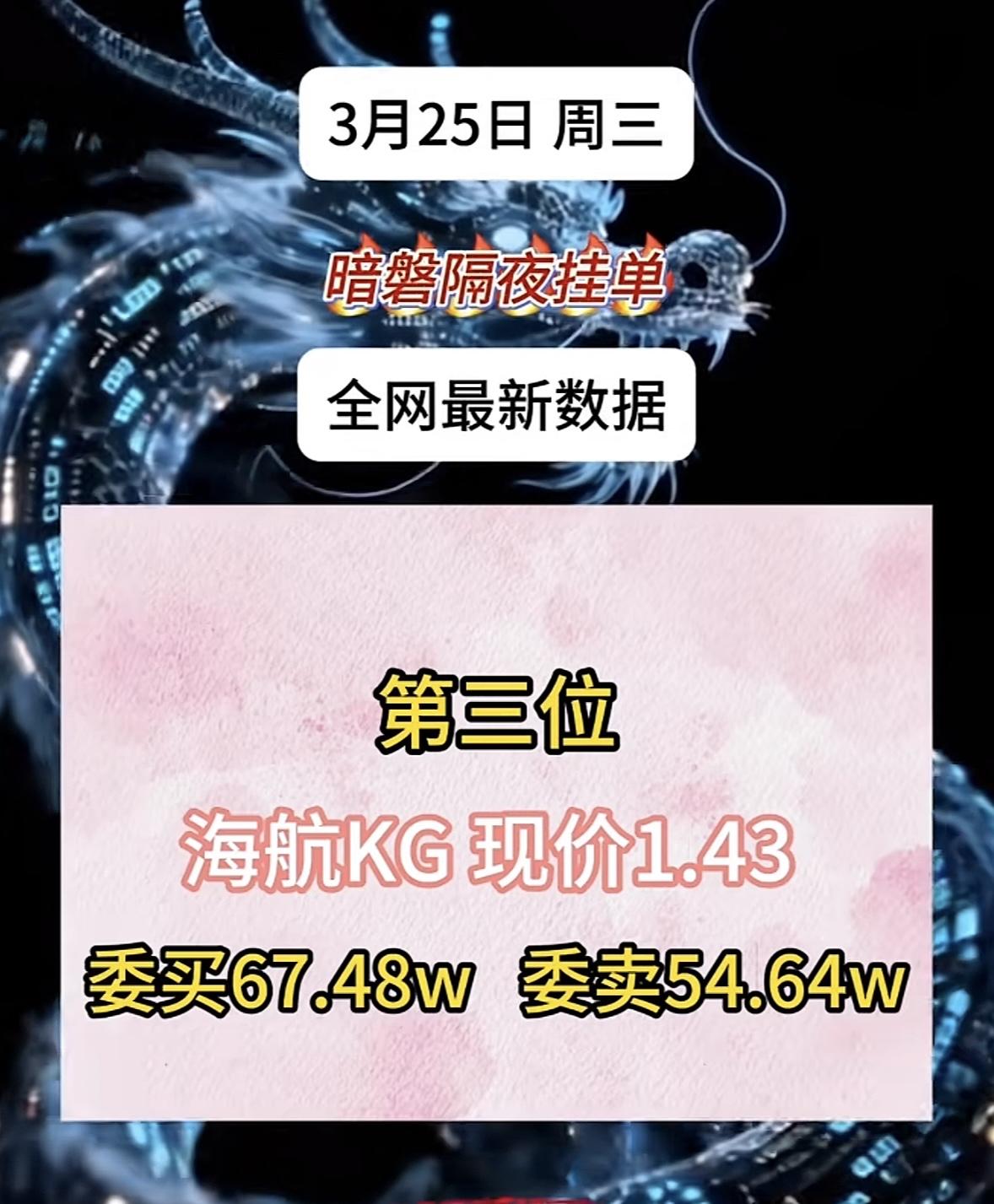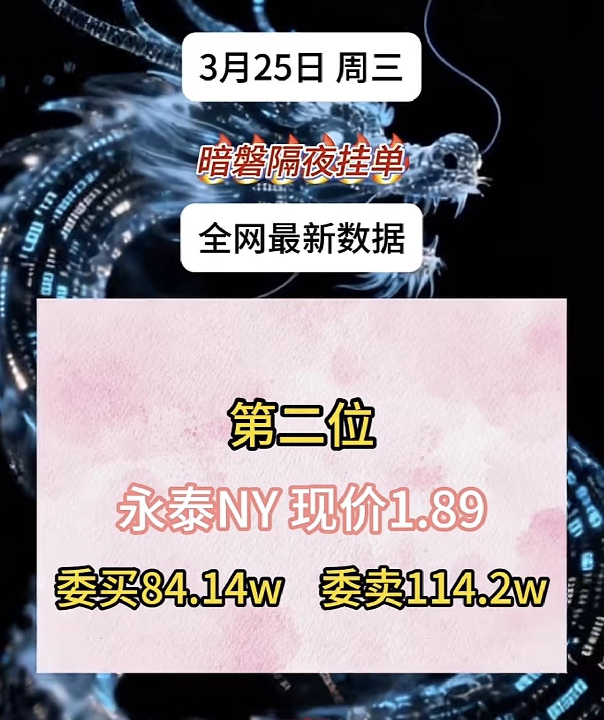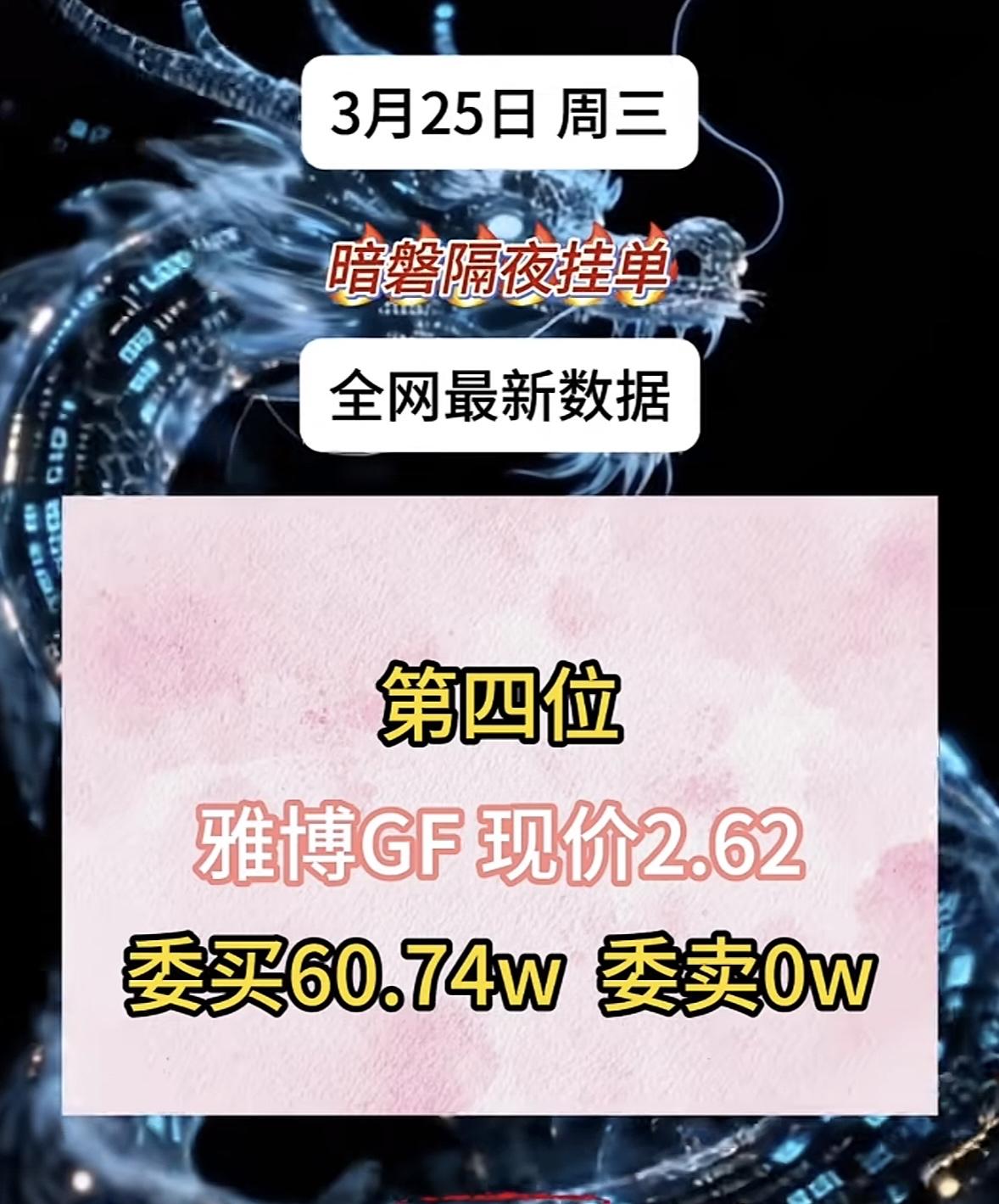 3月25日暗盘隔夜挂单排行榜出炉 3月25日雅博股份现价2.62元,买单60.74万。这票最近很火,8个交易日录得4个涨停。截至9时37分,涨幅达10.08%,总市值55.57亿元,封板资金8.57亿元。 它能这么火,原因不少。题材上,它有BIPV、异质结电池HJT、储能概念,光伏板块细分领域逆势走强时它成了龙头。还有国资背景,山东枣庄市国资委控股,重整后财务风险降低。业务也转型了,新能源业务占比超60%。不过,它2025年预计亏损,新能源业务盈利兑现还需时间,股价波动大,投资得谨慎。
