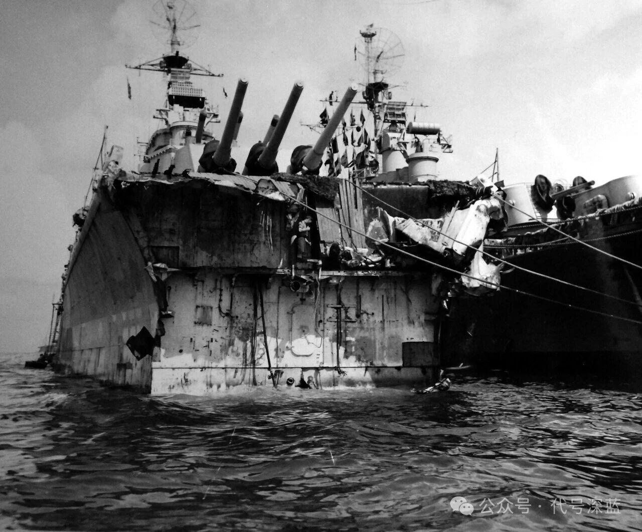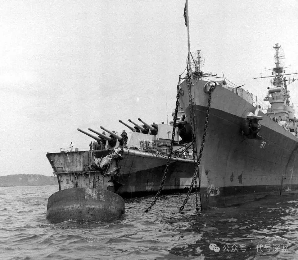 1945年6月5日,巴尔的摩级“匹茨堡”号重巡洋舰(CA-72)在前往关岛临时停留途中,遭遇台风袭击,其舰首损失长达104英尺(约31.7米)。巡洋舰 军事 战舰 战舰世界 战争雷霆 二战