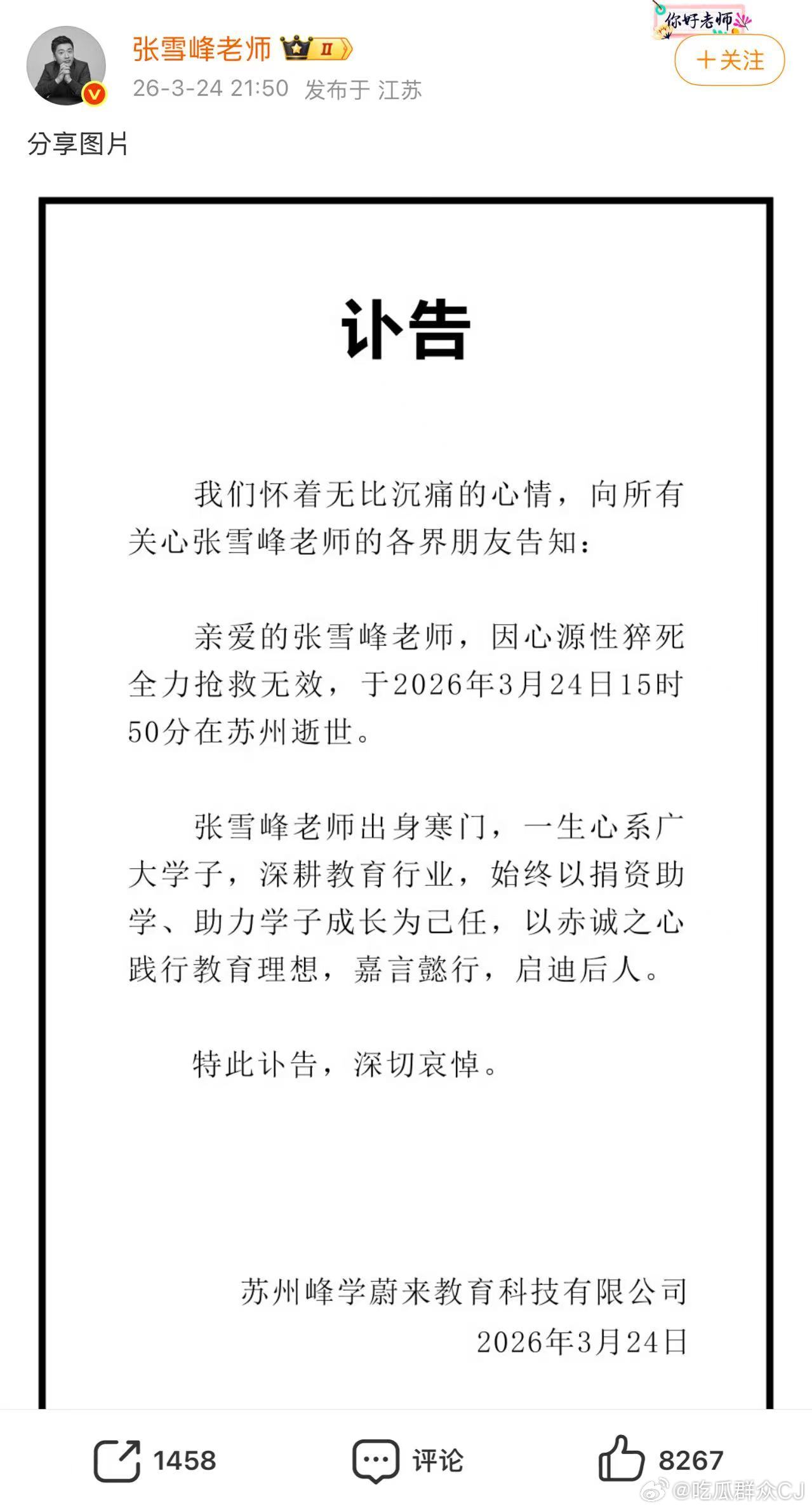 张雪峰公司发讣告了,张雪峰因为心源性猝死抢救无效,今天下午在苏州逝世。张雪峰公司发布讣告