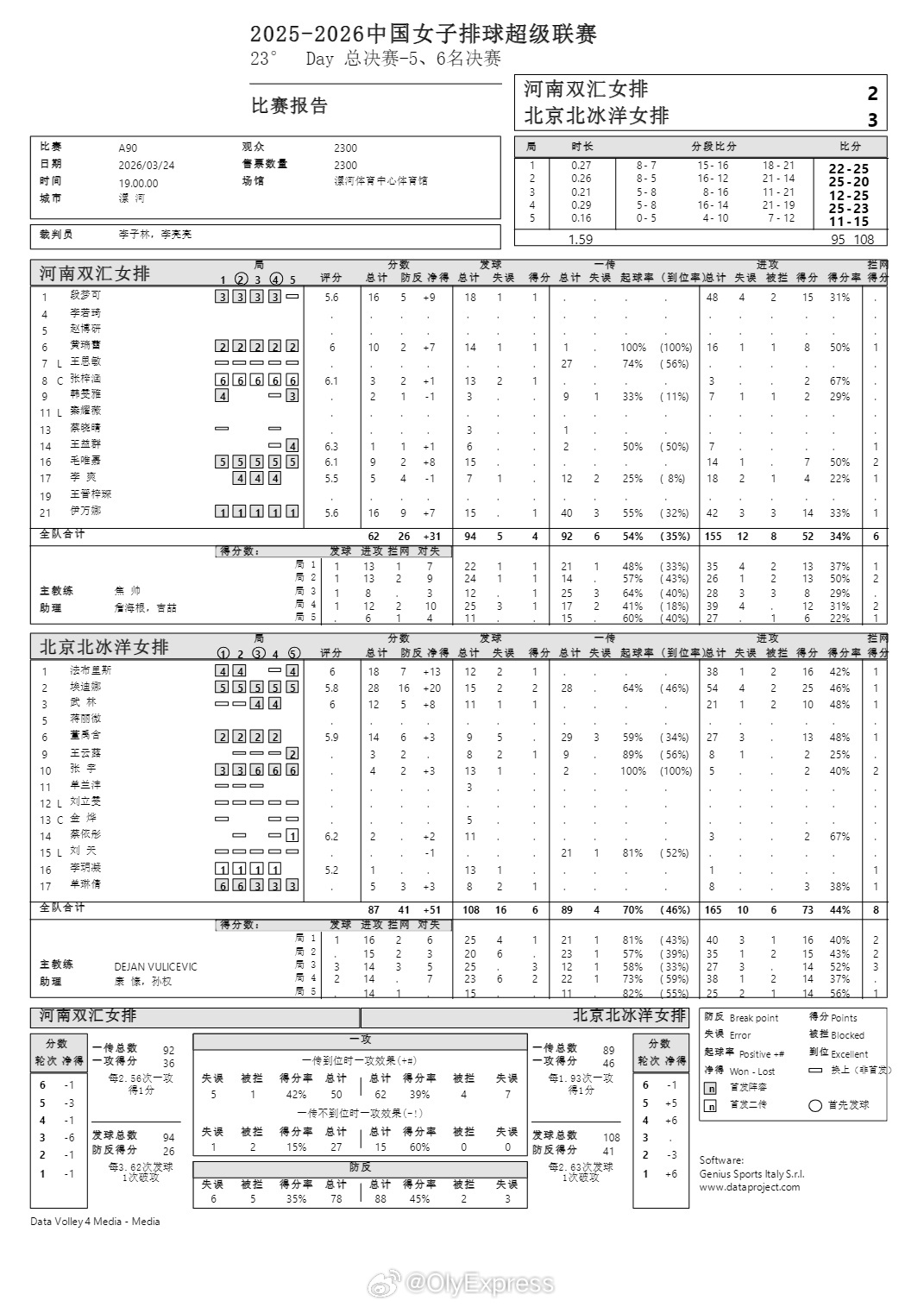 排超联赛 3月25日,排超女排联赛季军战首回合天津1-3山东技术统计。
