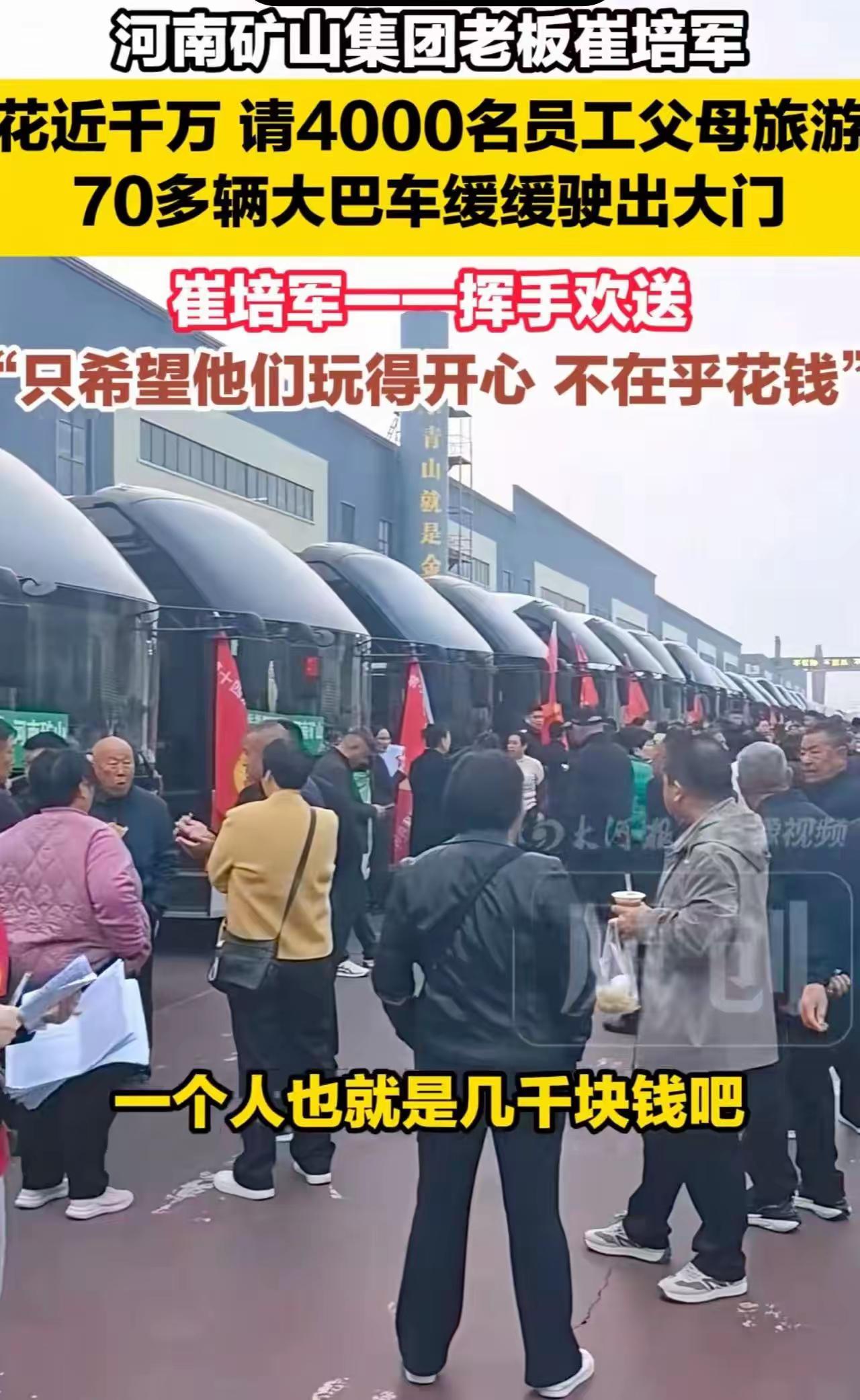 崔培军又让多少老板咬牙切齿?豪掷千万请4000名员工父母旅游,全网打工人羡慕:“我老板什么时候能这么大方?” 2026年3月24日,河南矿山集团启动了第十四届“孝文化感恩旅游节”。场面那是相当壮观! 别的老板在算怎么克扣工资,他在算怎么给员工父母花钱;别的公司在研究怎么让员工加班,他在研究怎么让员工陪父母旅游。崔培军这个“别人家的老板”,不仅让全网打工人酸了,更让那些只会画大饼的老板们,恨得牙痒痒——因为他们终于明白,为什么自己的员工总想跳槽了。 4000名员工父母,包机、包车、包吃、包住、包玩,豪掷千万,年年如此,一办就是十四届。 当别的公司还在为“要不要给员工发端午粽子”纠结时,崔培军已经把员工的父母都安排得明明白白。这画面,别说打工人羡慕,连我看了都想问一句:老板,还招人吗? 但今天,我们不只谈羡慕,我们来聊聊:为什么崔培军这样做,让那么多老板“咬牙切齿”? 第一,因为他在用行动告诉所有老板:员工不是“工具人”。 在太多老板眼里,员工是什么?是成本,是螺丝钉,是随叫随到的“牛马”。加班时谈“奉献”,发工资时谈“困难”,裁员时谈“优化”。他们嘴上说着“公司是家”,心里算的却是“怎么用最少的钱,榨出最多的价值”。 可崔培军呢?他把钱花在了员工父母身上。这背后的逻辑是什么?是“你把我的员工当人看,我就把公司当家看”。他太懂人性了:想让员工死心塌地,光给工资不够,你得让他觉得,在这个公司,他是有尊严的,他的家人是被尊重的。 那些只会画大饼的老板,最怕的就是这种“对比”。因为一比,他们的“狼性文化”“996福报”就全露馅了。 第二,他撕开了“中国式管理”的遮羞布。 很多老板觉得,管理就是要“严”,要“狠”,要让员工怕你。可崔培军用十四年的坚持证明:最好的管理,是让员工心甘情愿跟你干。 你想啊,一个公司,连续十四年花钱请员工父母旅游,这背后的信任成本得有多高?员工会想:老板对我父母都这么好,我要是工作不努力,对得起谁?这种发自内心的驱动力,比任何KPI都管用。 而那些只会“咬牙切齿”的老板,他们不懂这个道理。他们以为员工跳槽是因为“钱没给够”,其实很多时候,是因为“心凉透了”。 第三,他重新定义了“企业成功”的标准。 在这个凡事讲“效率”、讲“回报率”的时代,崔培军干了一件“傻事”:把钱花在“没有直接产出”的地方。请员工父母旅游,能直接提升公司利润吗?不能。能直接拿下更多订单吗?不能。 但他得到了什么?他得到了一群把公司当家的员工,得到了一个14年没变过的企业文化,得到了全网打工人自发为他“代言”的口碑。这些东西,花多少钱都买不来。 那些“咬牙切齿”的老板,不是心疼钱,是心疼自己怎么就没想到这一层。他们终于发现:原来“收买人心”,还可以这么玩。 最后,我想对所有打工的朋友说: 如果你遇到崔培军这样的老板,请珍惜。如果没有遇到,也别气馁。因为这件事告诉我们一个道理:真正聪明的老板,都懂得把员工当“人”看,而不是当“成本”算。 至于那些还在“咬牙切齿”的老板们,我只想说一句:与其羡慕别人家的员工,不如学学别人家的老板。毕竟,人心都是肉长的,你对员工什么样,员工就对公司什么样。 这道理,崔培军懂,你懂了吗?