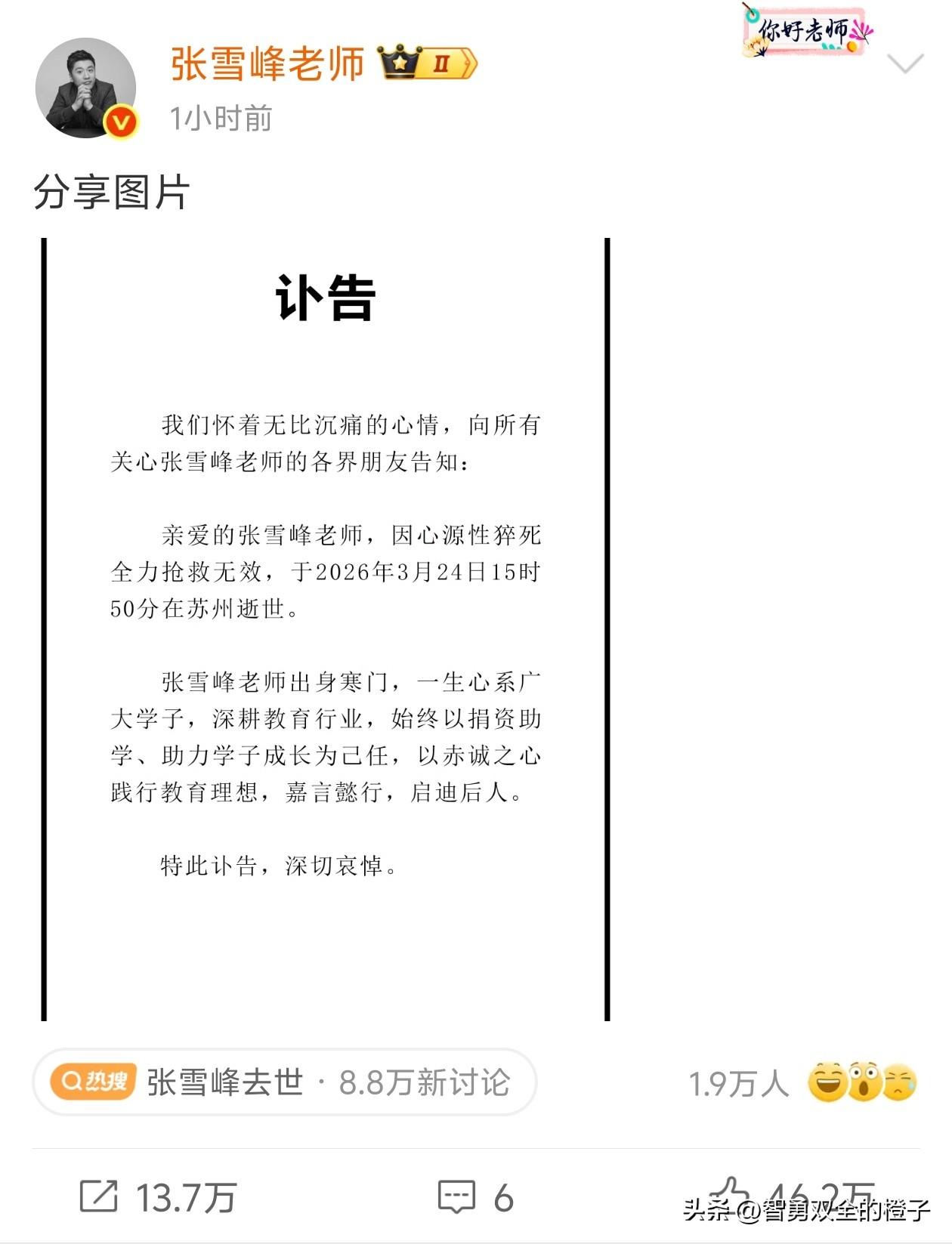 看来是真的了,张雪峰老师账号已经发了讣告,确认是跑步的时候,突发心源性猝死,下午看到消息的时候,一直以为有人在造谣,传谣,没有当真,可此时多么希望是谣言! 张老师是一个特别实在的人,从来不讲虚的,帮助过许多高考的孩子,给他们实打实的指导,没有虚的和套话,会根据学生的家庭情况给出不同的建议。 想起一句话:天妒英才啊,张雪峰老师才41岁,正是人生壮年的时候,太令人惋惜了。 张老师,一路走好[祈祷][祈祷][祈祷]