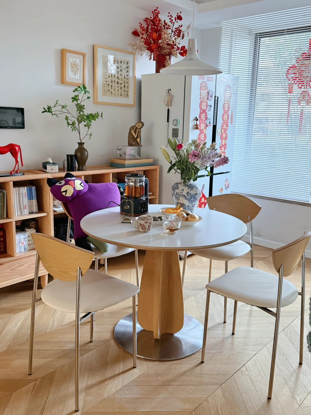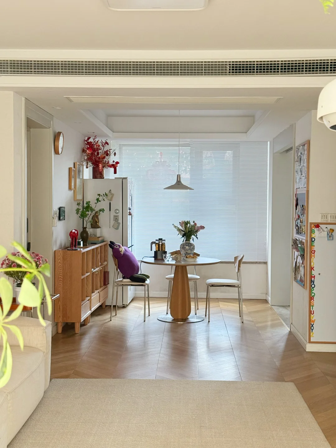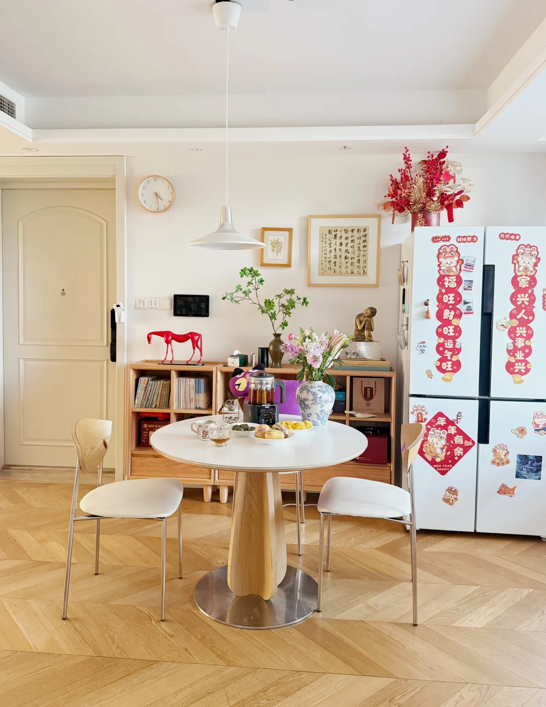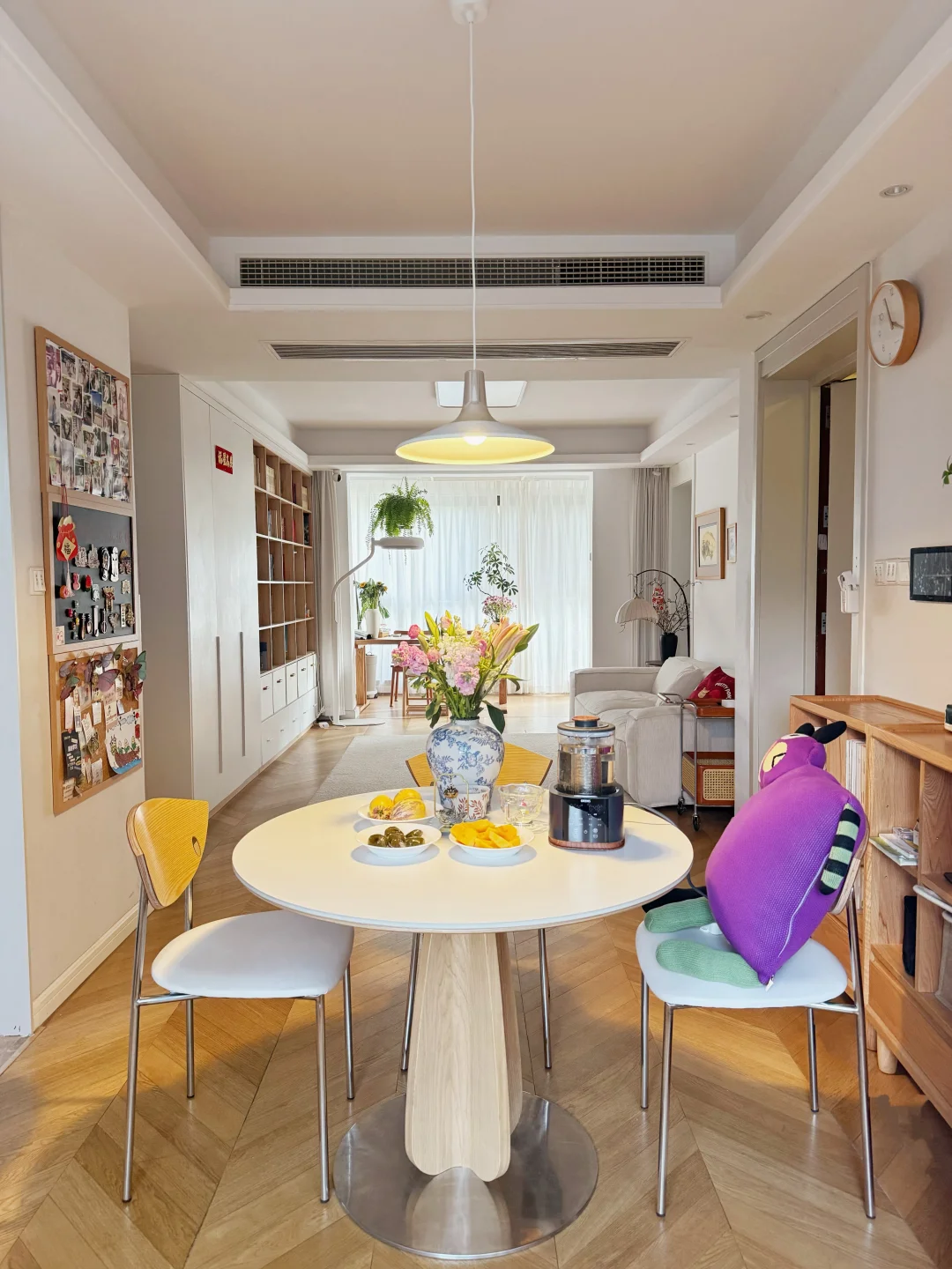 精装房改造最明智的决定! 就是把客餐+书房做在一起 客厅既保留客厅的功能 也增加了书房的功能 定制了一整面墙的书柜 收纳力超足, 书籍、摆件都能放 颜值与实用并存, 家里瞬间有书香气息 餐厅放了一张圆桌 奶白+原木温柔感拉满 最近爱上了喝茶,周末在家 和队友两个人围坐餐桌 用纯钛煮茶壶煮一壶红茶、 和队友两个人, 一起喝喝茶,吃吃点心。 真得超惬意 实用又提升生活幸福感 精装房改造后动线超流畅 空间利用率拉满 休息日宅在家里, 真得不想出门, 每天都很治愈~