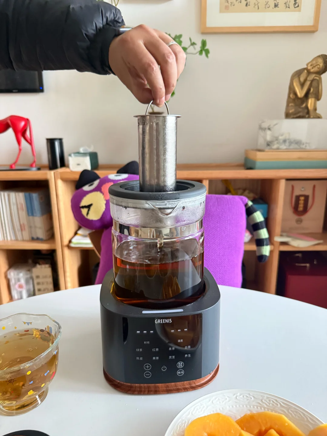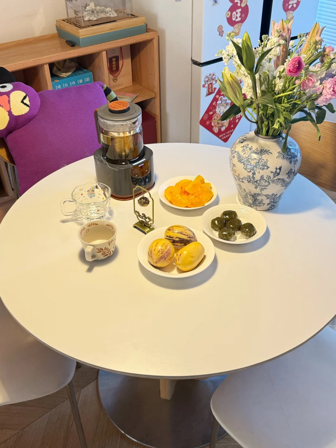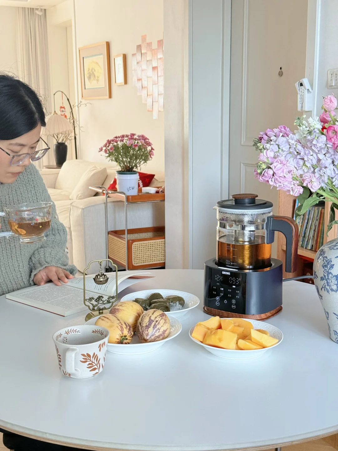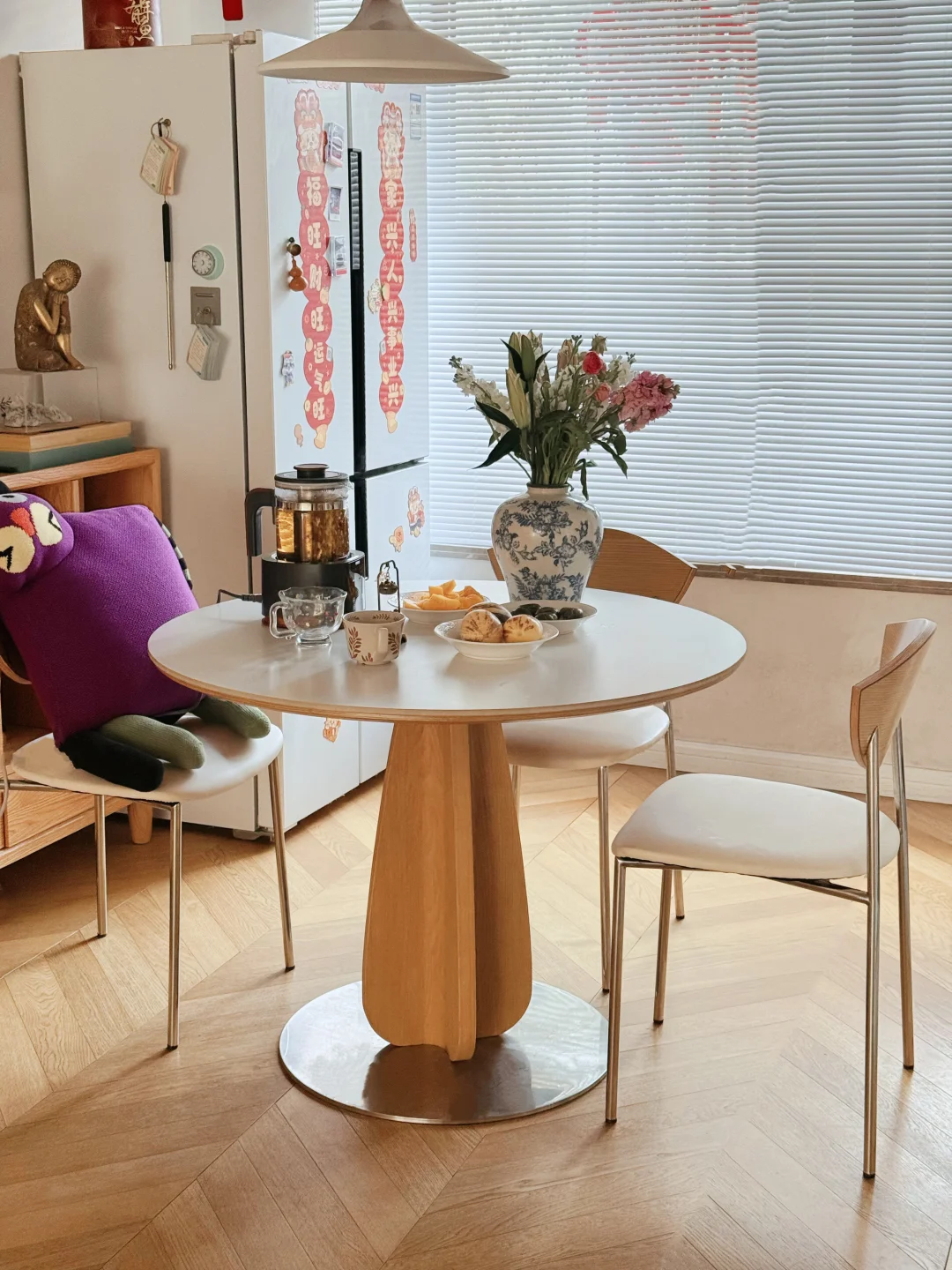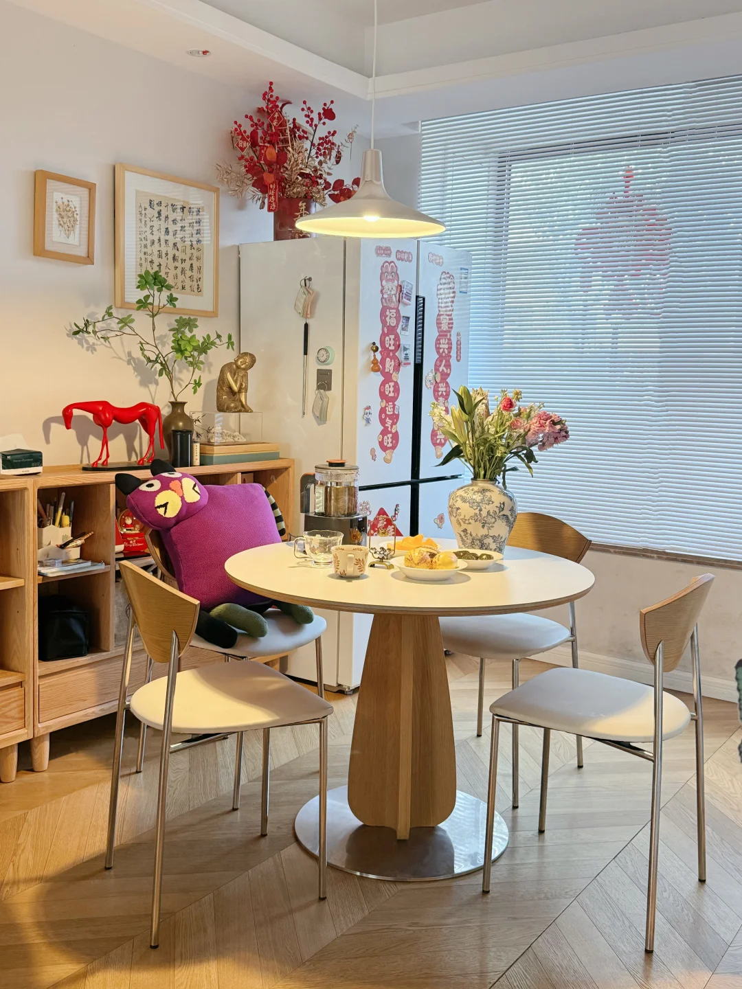 精装房改造最明智的决定! 就是把客餐+书房做在一起 客厅既保留客厅的功能 也增加了书房的功能 定制了一整面墙的书柜 收纳力超足, 书籍、摆件都能放 颜值与实用并存, 家里瞬间有书香气息 餐厅放了一张圆桌 奶白+原木温柔感拉满 最近爱上了喝茶,周末在家 和队友两个人围坐餐桌 用纯钛煮茶壶煮一壶红茶、 和队友两个人, 一起喝喝茶,吃吃点心。 真得超惬意 实用又提升生活幸福感 精装房改造后动线超流畅 空间利用率拉满 休息日宅在家里, 真得不想出门, 每天都很治愈~