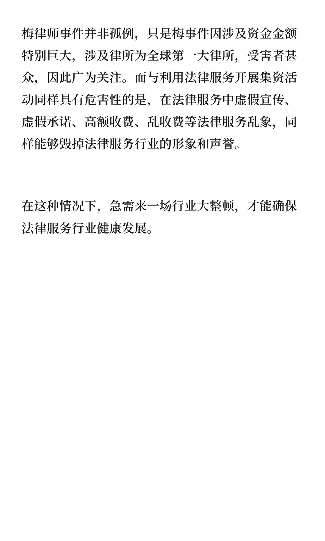 梅律师事件并非孤例,只是梅事件因涉及资金金额特别巨大,涉及律所为全球第一大律所,受害者甚众,因此广为关注。而与利用法律服务开展集资活动同样具有危害性的是,在法律服务中虚假宣传、虚假承诺、高额收费、乱收费等法律服务乱象,同样能够毁掉法律服务行业的形象和声誉。
