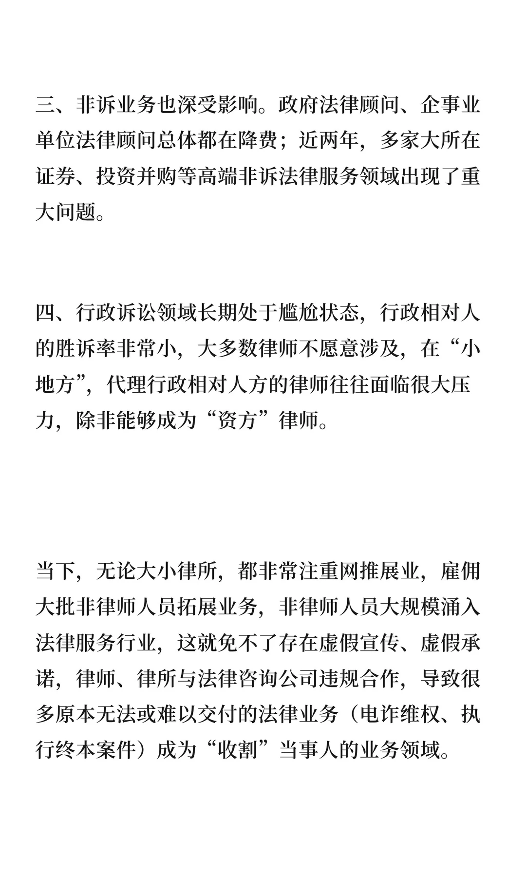 三、非诉业务也深受影响。政府法律顾问、企事业单位法律顾问总体都在降费;近两年,多家大所在证券、投资并购等高端非诉法律服务领域出现了重大问题。
