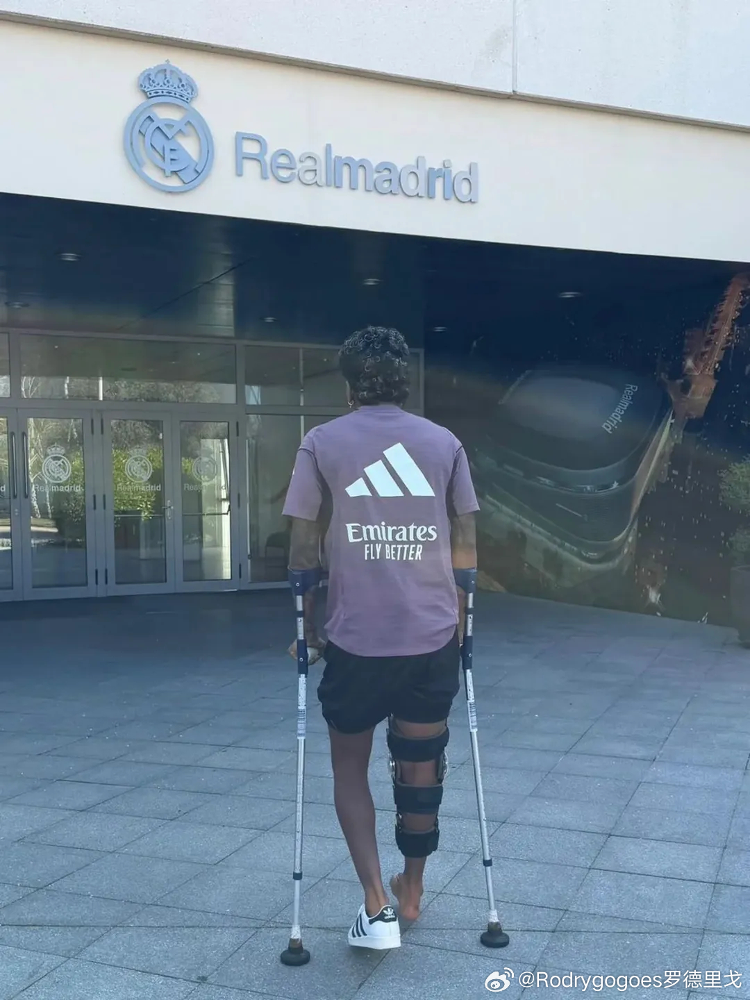 罗德里戈拄向训练基地的背影