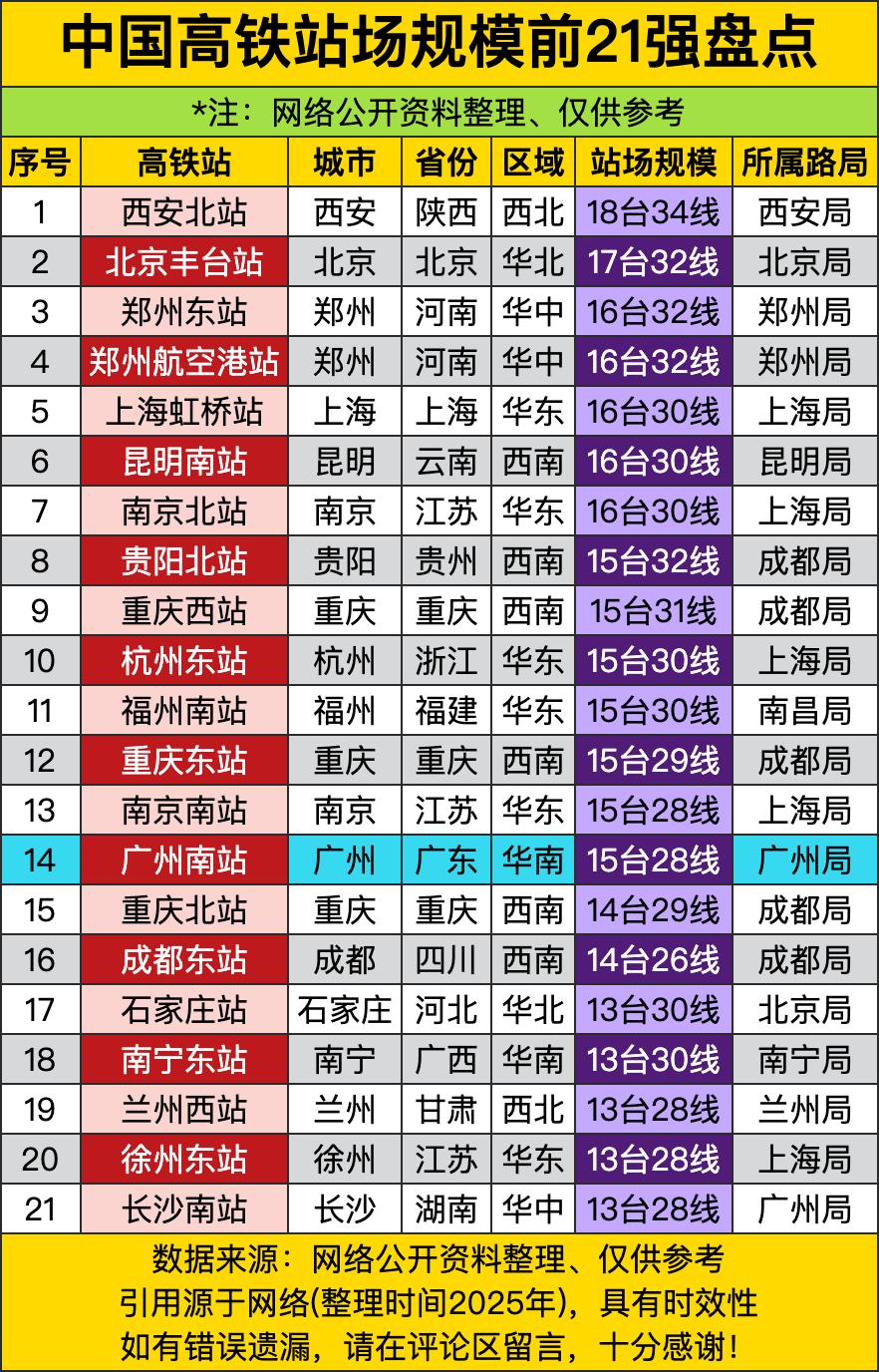西安北站18台34线,全国最大高铁站,把北京丰台、郑州东都踩在脚下。西安人修高铁站跟修兵马俑似的,恨不得把全世界的人都装进去。关键是西安局就靠这一个站撑场面,其他站都只能算小弟。北京丰台17台32线排第二,首都人民就是不认输,你西安大是吧?我北京更大!虽然台数少一台,但线数就少2条,这波不亏。 郑州东站和郑州航空港站都是16台32线,郑州局一下拥有两个超大站,简直赢麻了。郑州作为高铁枢纽,东西南北都要经过,不修大点对不起这地理位置。关键是这俩站还离得不远,一个在东一个在南,郑州人出门坐高铁,跟逛超市一样方便。上海虹桥16台30线排第五,作为华东老大,居然被郑州压一头,上海局估计憋着一口气,南京北站马上要建好了,到时候看谁更大。 昆明南站16台30线排第六,贵阳北站15台32线排第八,这俩西南兄弟把高铁站修得比广州南还大。昆明局这是要逆天,云南那地形,修条铁路都费劲,修个高铁站倒是舍得花钱。贵阳北站15台32线,台数比昆明少一台,线数却多2条,贵阳人这是要把高铁当公交开啊。重庆更狠,重庆西、重庆东、重庆北三个站上榜,加起来46台89线,把全国其他城市按在地上摩擦。 广州南站15台28线才排第十四,作为华南老大,这排名属实丢人。但人家广州南站客流量全国第一,站台少点没关系,人多就行。南京南站15台28线排第十三,苏大强也不甘示弱,虽然台数不多,但人家站场精致啊。长沙南站13台28线垫底,湖南人表示无所谓,反正我们坐高铁去广州深圳打工,站小点没关系,能上车就行。