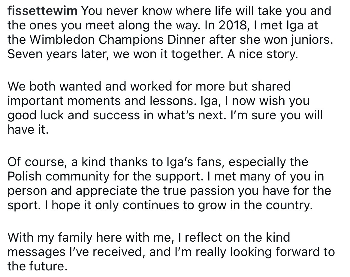 “你永远不知道人生会带你走向何方,也不知道沿途会遇见谁。2018年,伊加(Iga)夺得温网青少年组冠军后,我在冠军晚宴上认识了她。