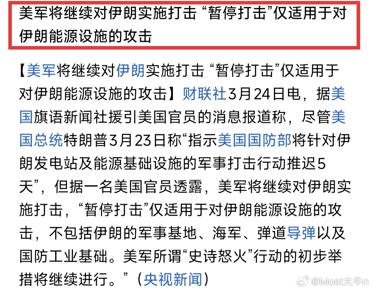 另外一边,美军也宣布:将继续打击伊朗的军事目标和导弹设施,懂王“暂停打击”的命令,仅限于伊朗的能源设施,不包括其他。